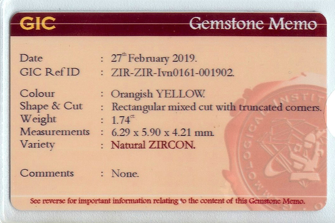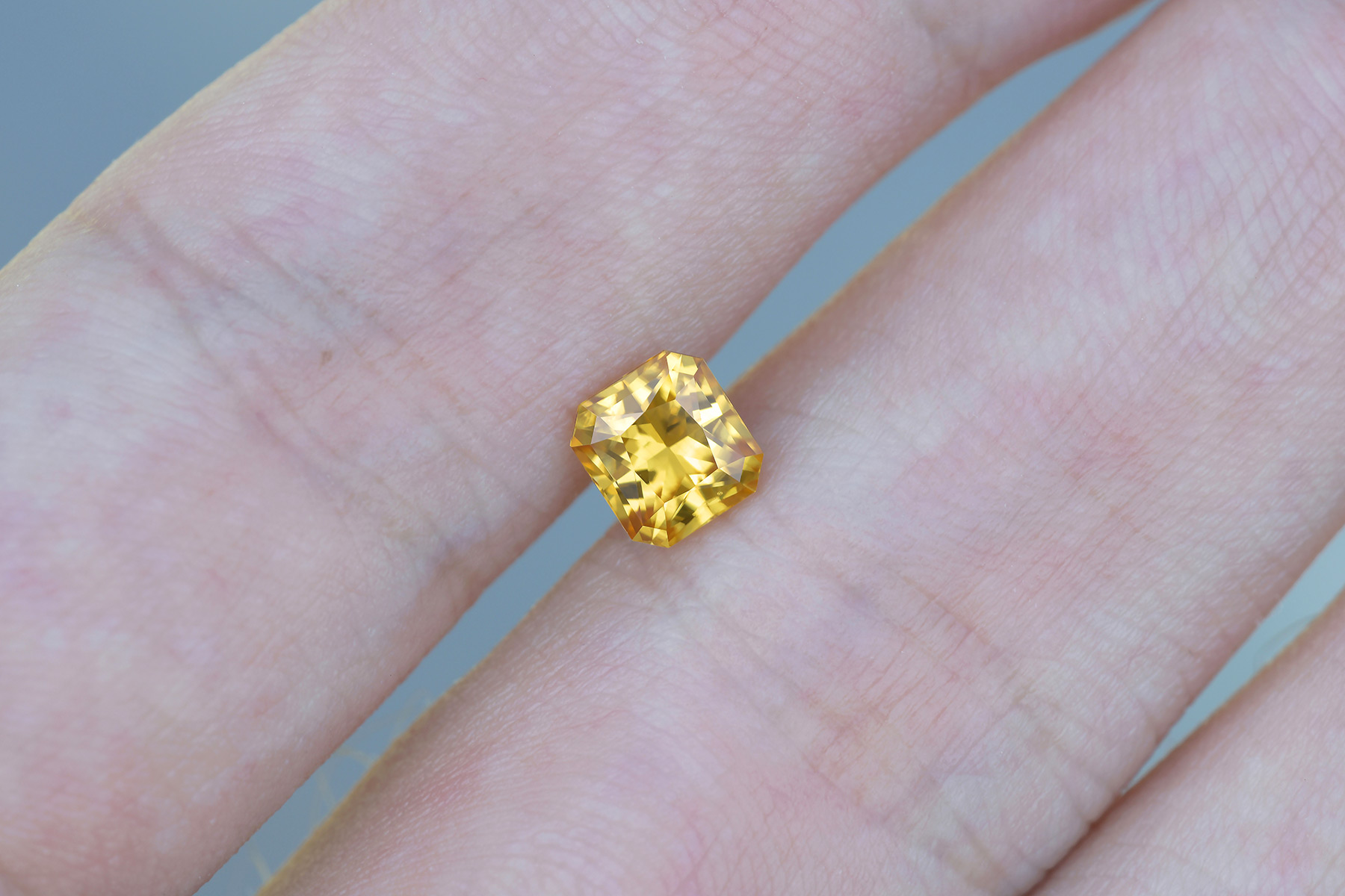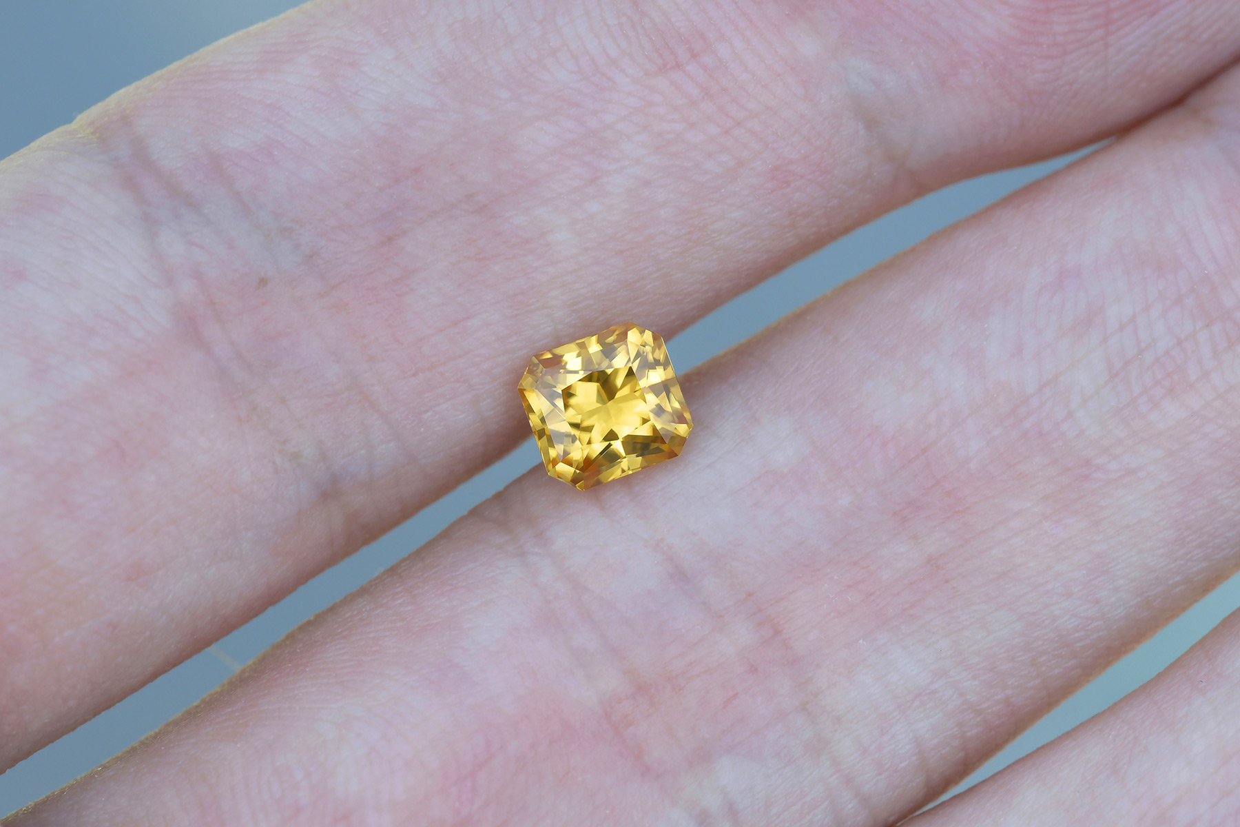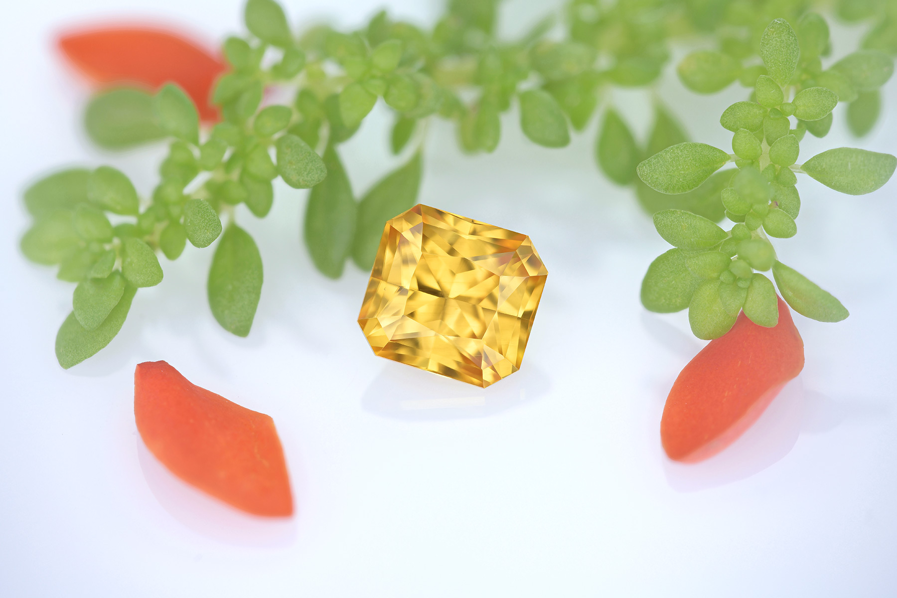 The cut complements the color really well – the four corners start out orange and seamlessly blend into the golden yellow hue of the middle, changing and shifting as the stone is rotated. The overall effect is both unusual and nice looking.