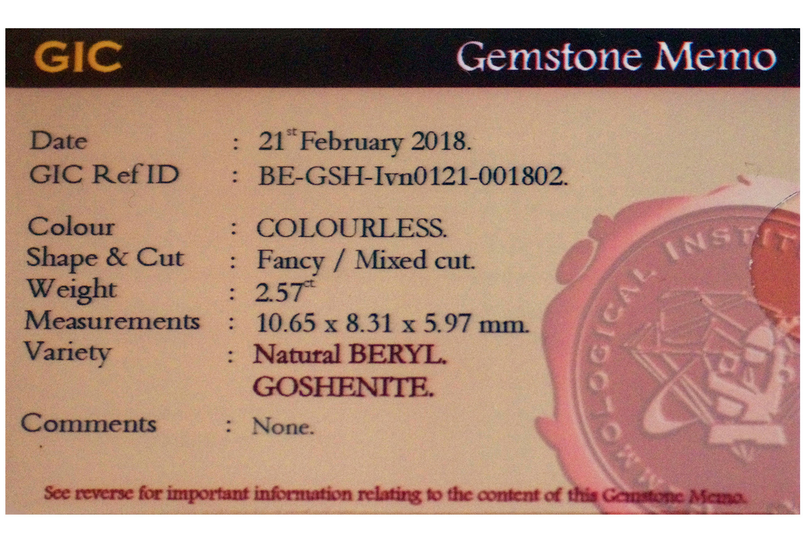 A lively colorless beryl, otherwise known as goshenite. Clean and cut into a sharp oval barion.