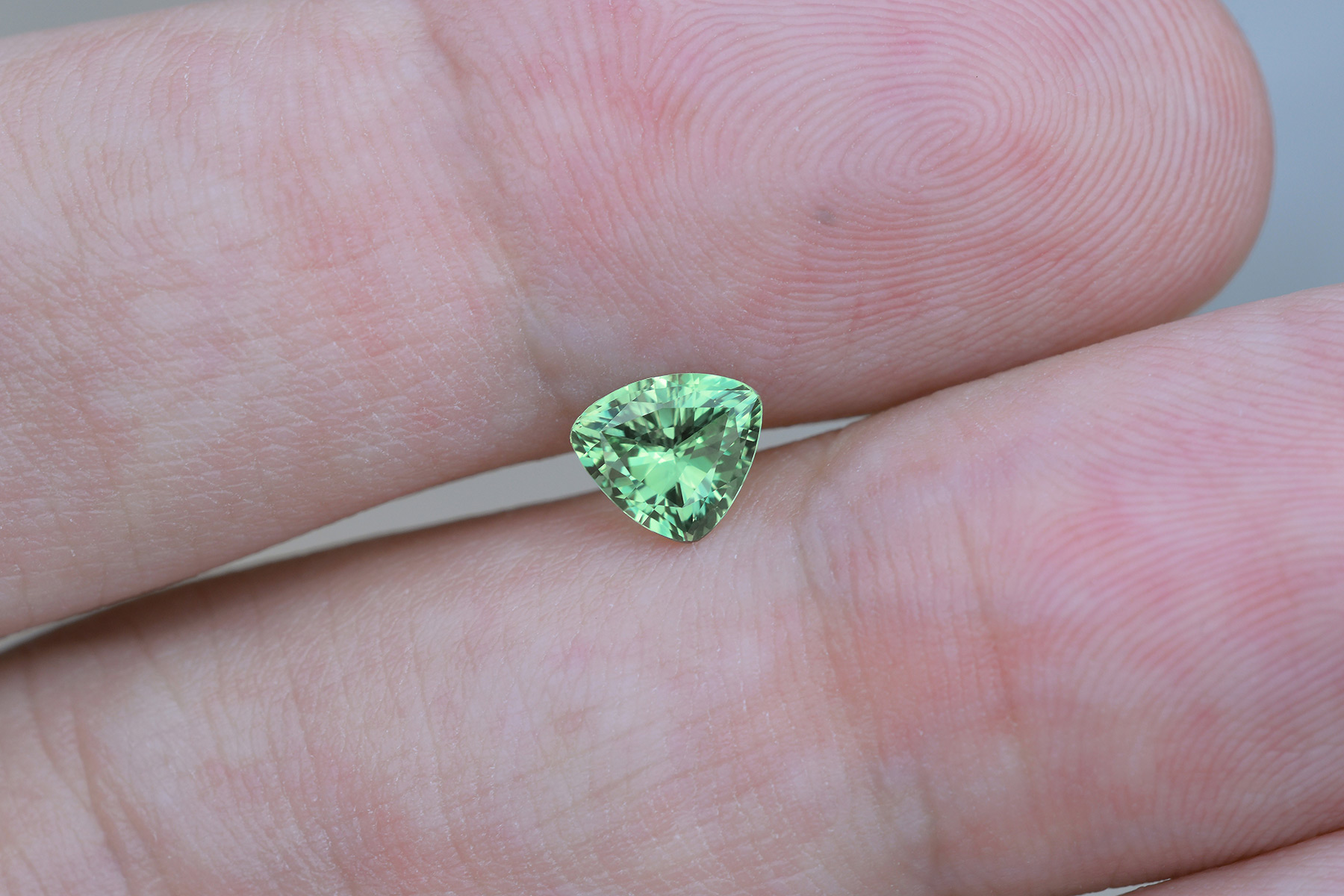 We were pretty lucky to buy it as a chrysoberyl, since any chrysoberyl with a daylight color this pleasant usually gets sold as an alexandrite in the gem markets of Sri Lanka regardless of the degree of change it may (or may not) exhibit.