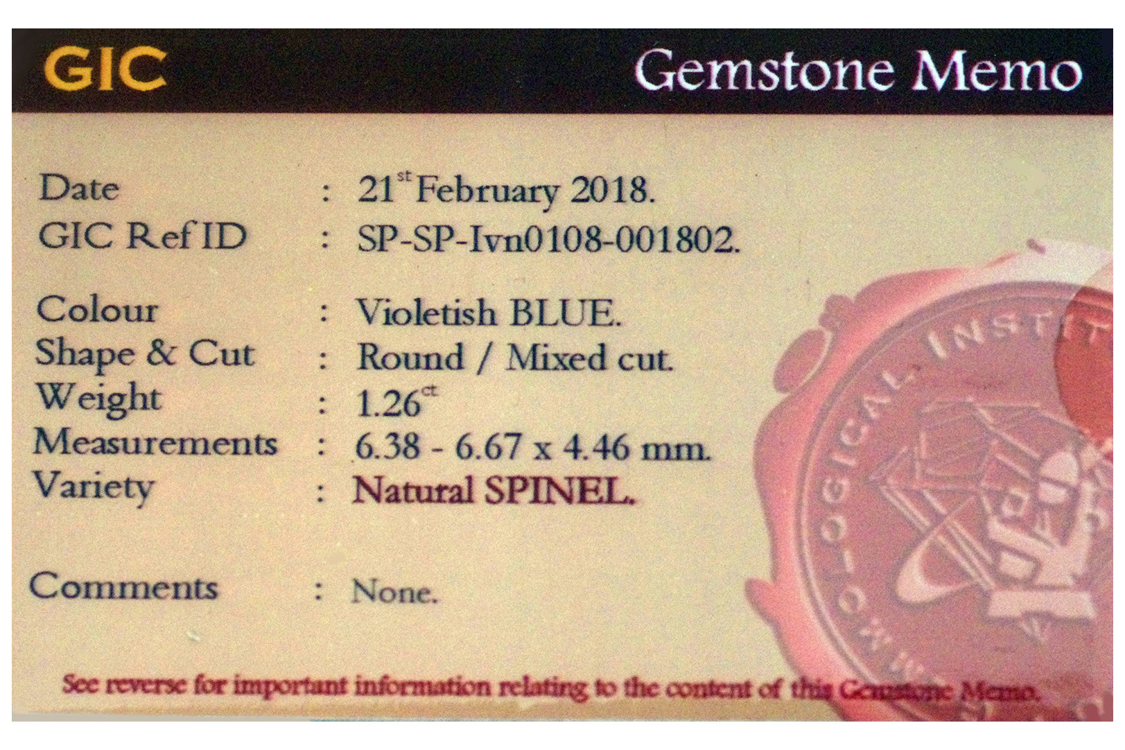 A card/brief format lab report is included with the stone