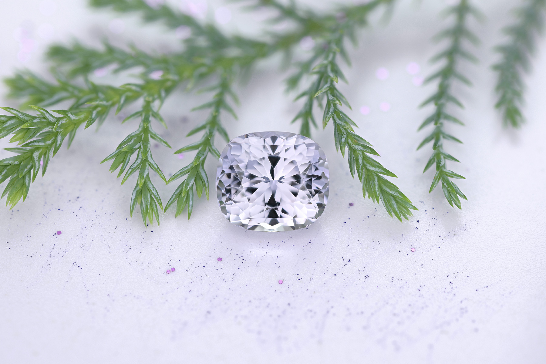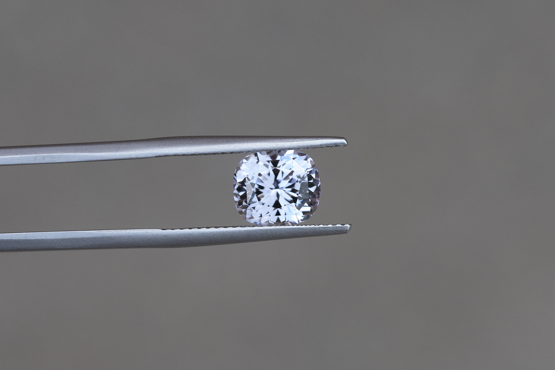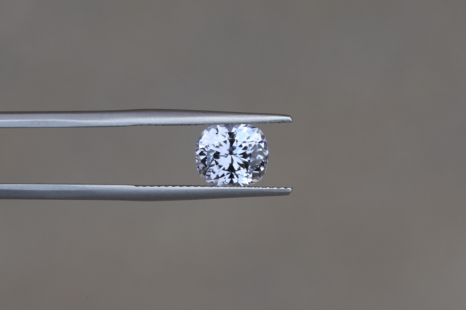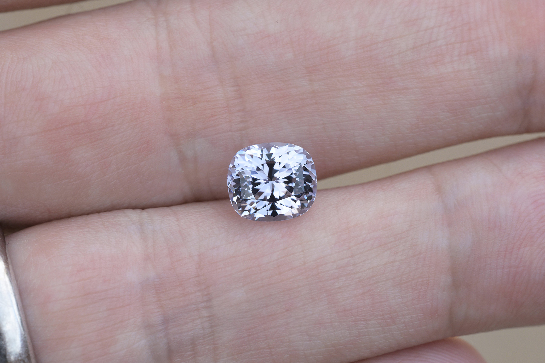 The stone changes colors quite a lot: it’s near-colorless with just a tinge of lavender in diffused daylight when fully lit, soft lavender or grey-periwinkle indoors during daytime, lavender-blue in fluorescent and lavender-mauve in incandescent light.