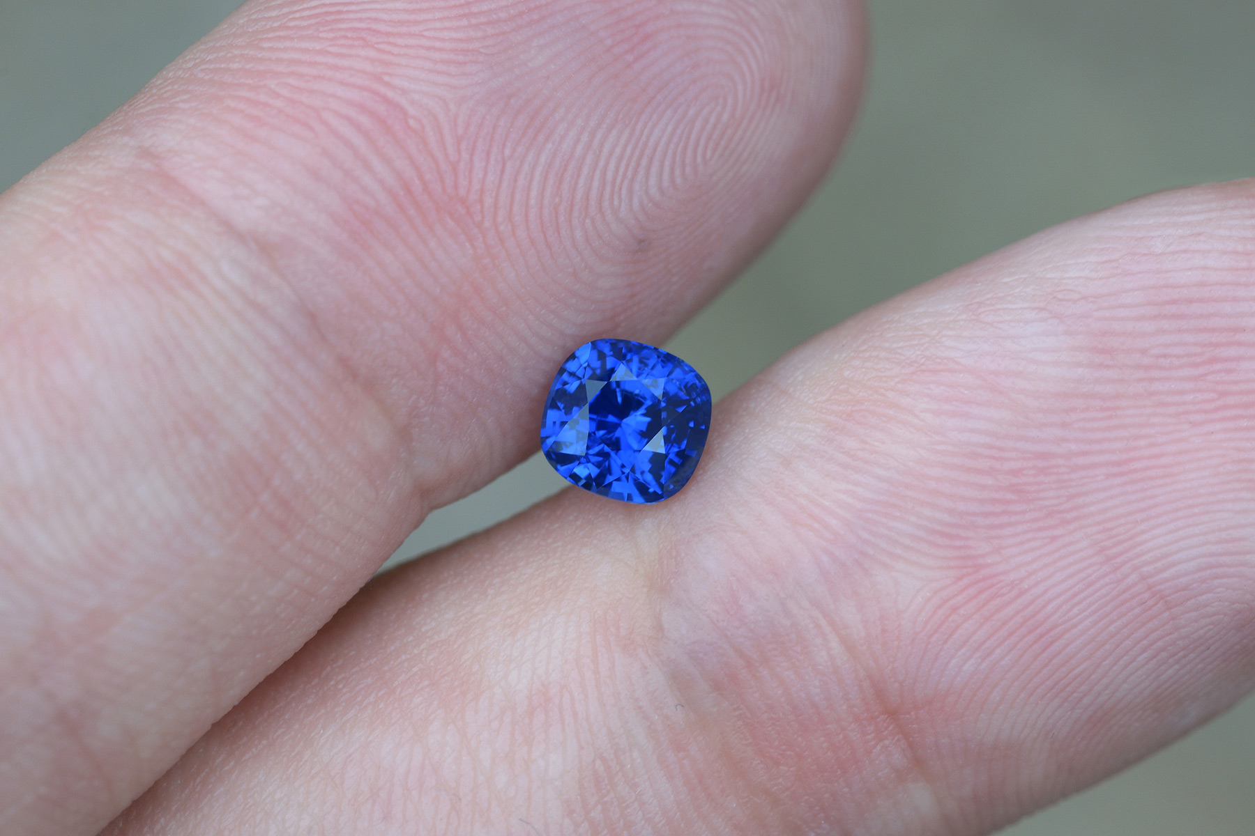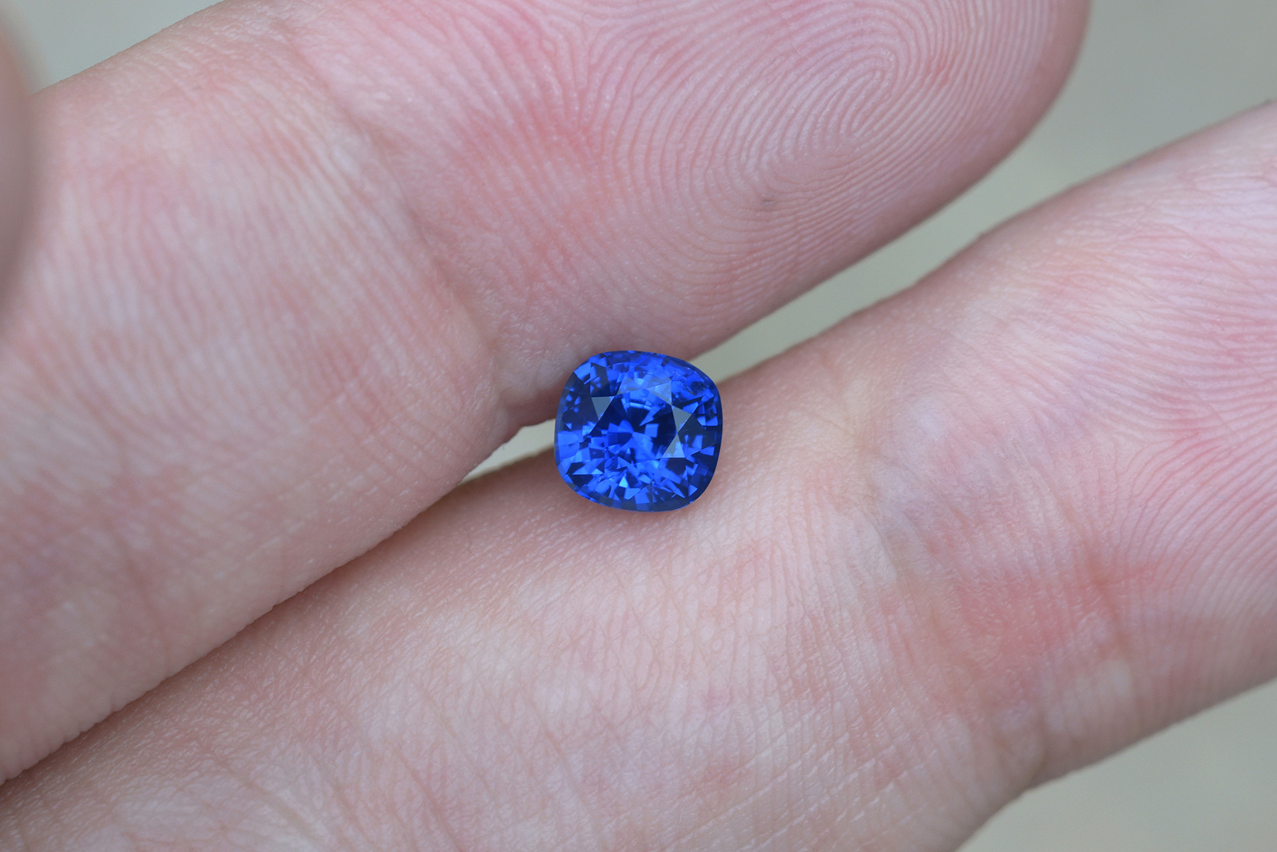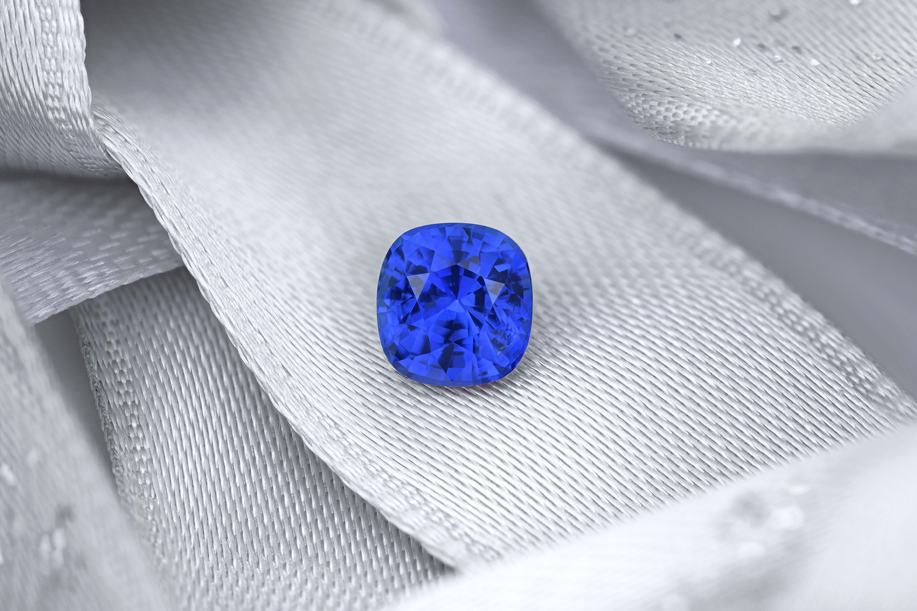 An exceptionally vivid, glowy blue sapphire in a rectangular cushion cut.