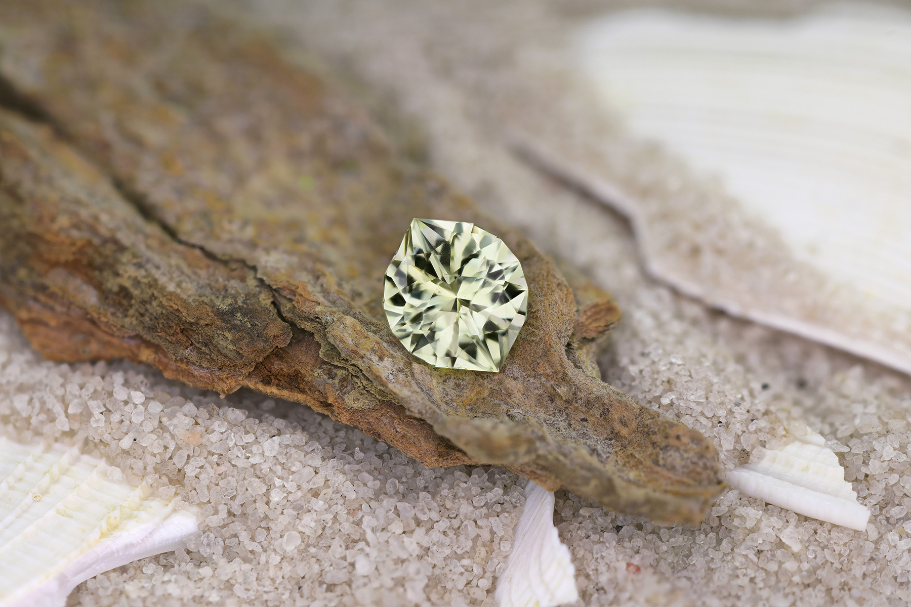 A bright, brilliant looking chartreuse sapphire in one of Jeffrey Hunt’s beautiful, imaginative designs.