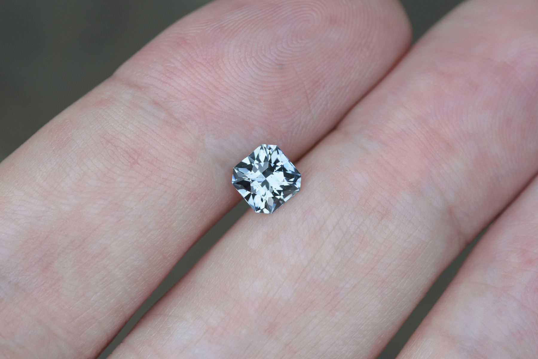 The stone's color is an uncommon grey with a slight blue-green tint. It shifts from whitish-grey in daylight outdoors to a very even looking bluish-greenish grey indoors.
