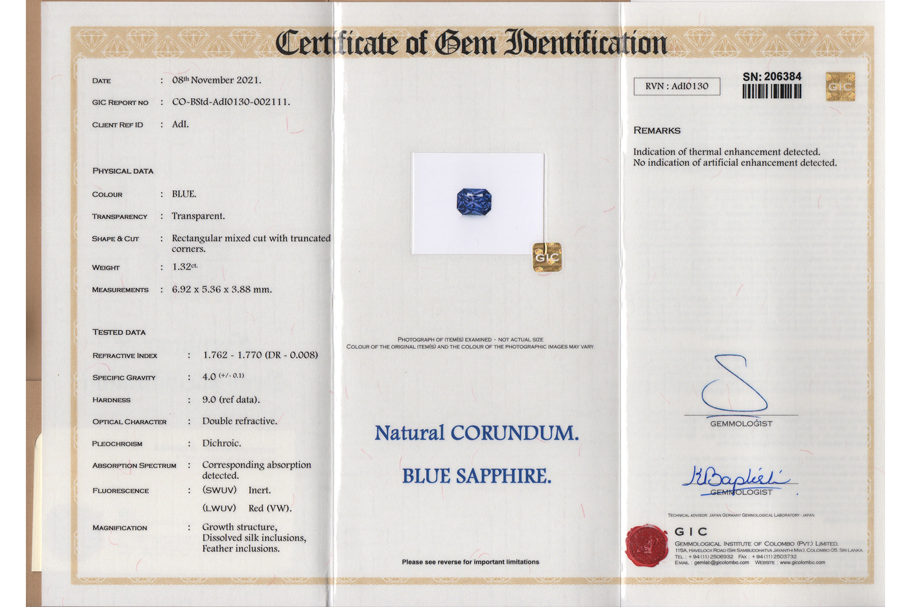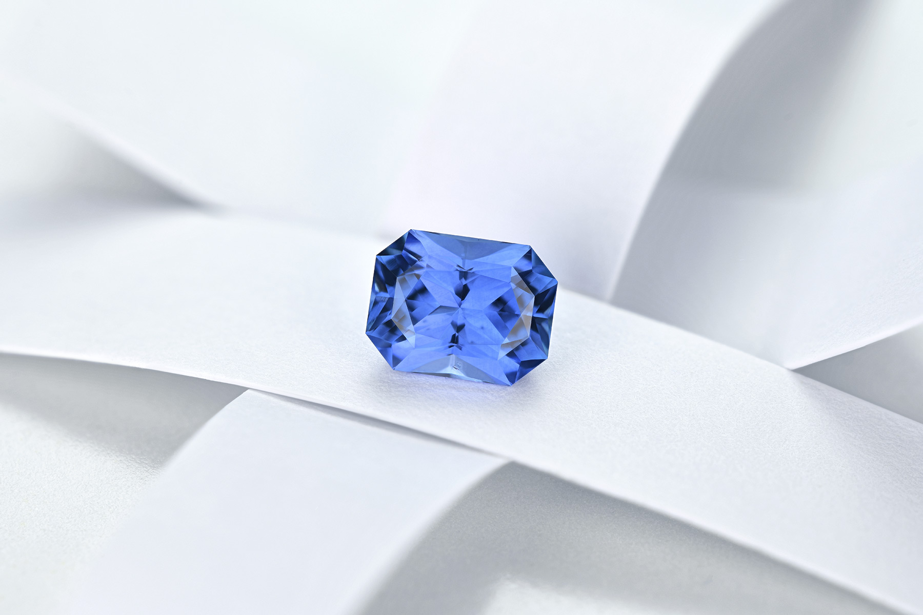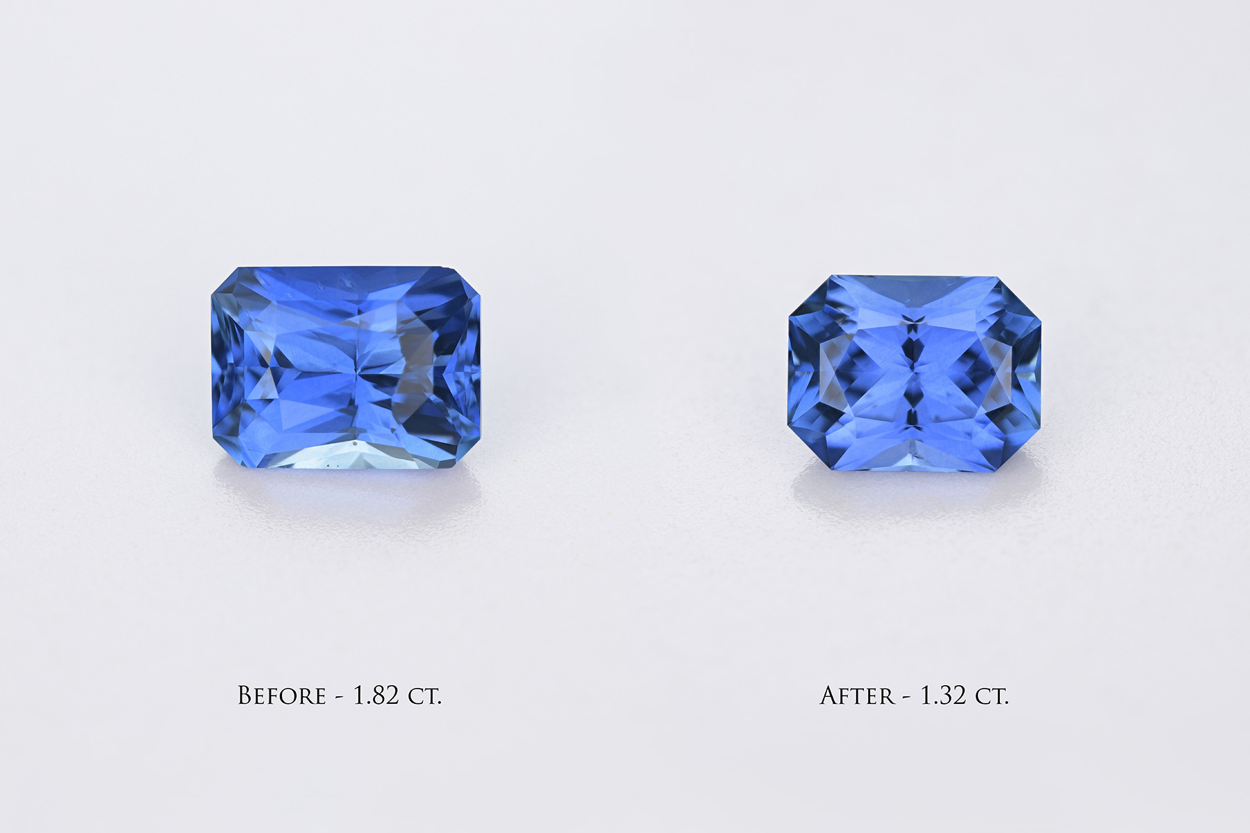 Recutting resulted in a well-proportioned stone with plenty of brilliance and an even light return pattern that’s typical of nicely cut radiant sapphires.