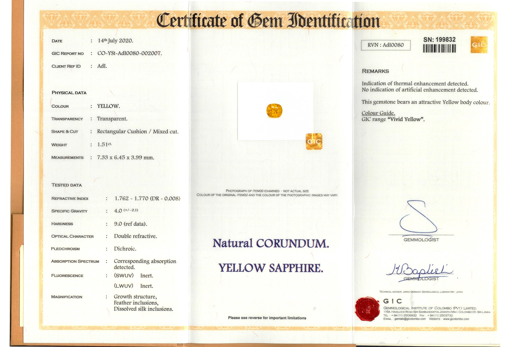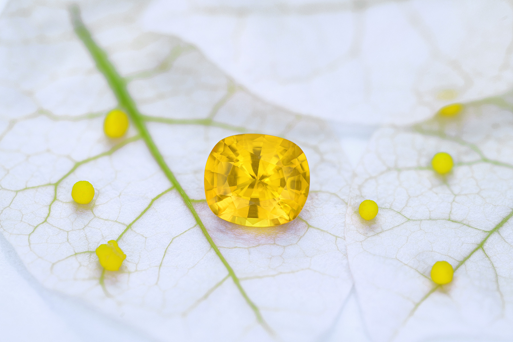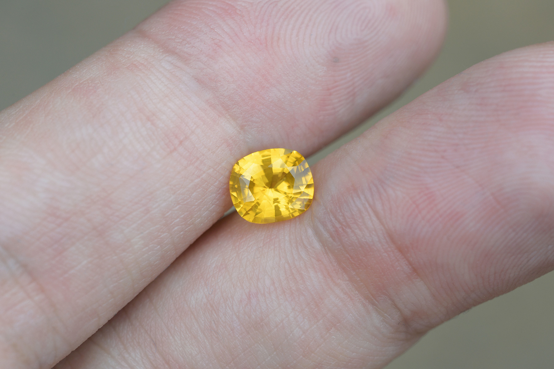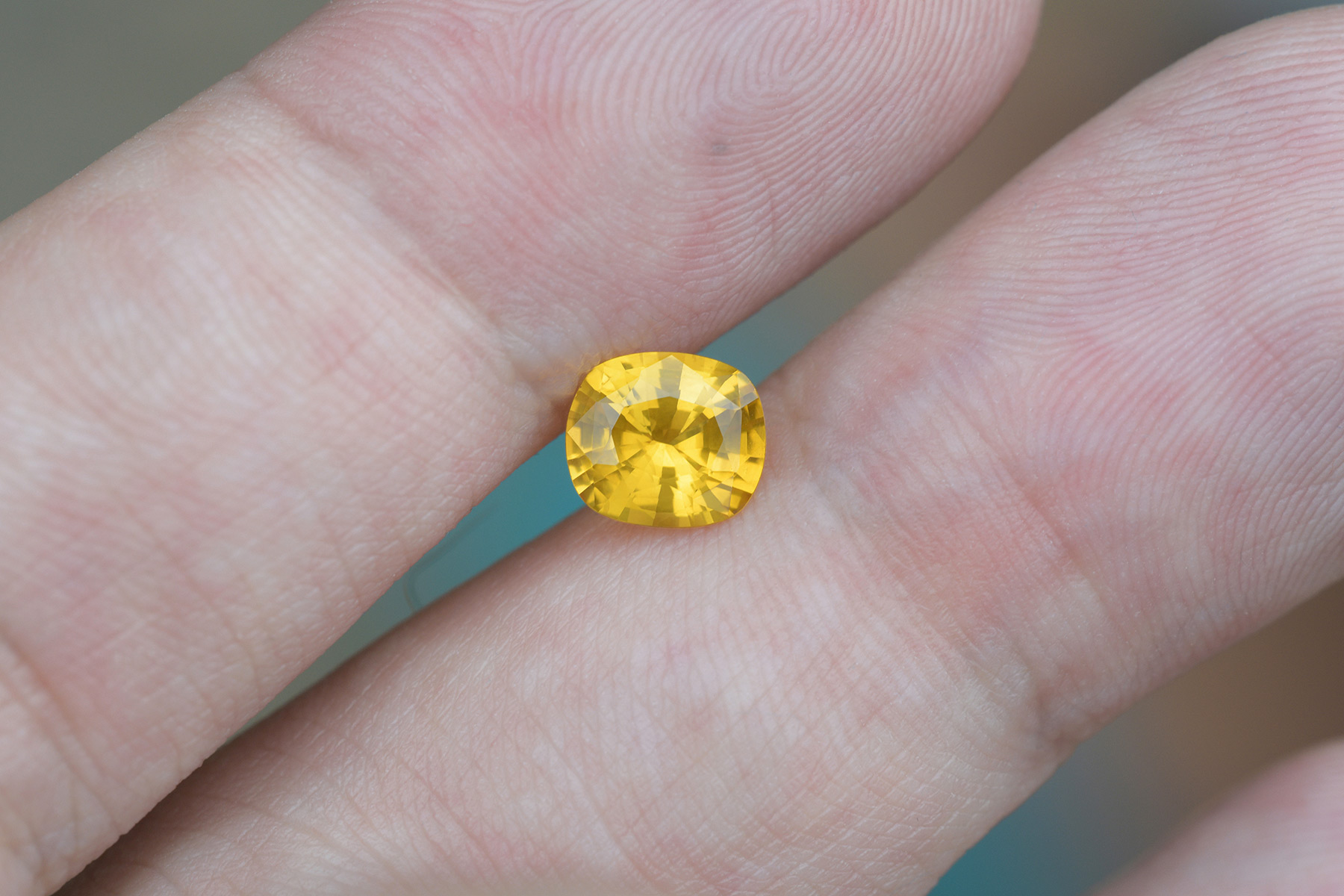 The hue is pure and well saturated, and the stone really comes into its own in dim and low light settings, such as ambient daylight indoors late in the afternoon. Low light gives rutile silk in sapphire a chance to do its magic, and the stone ends up looking attractively evened out and softly yellow as a result.