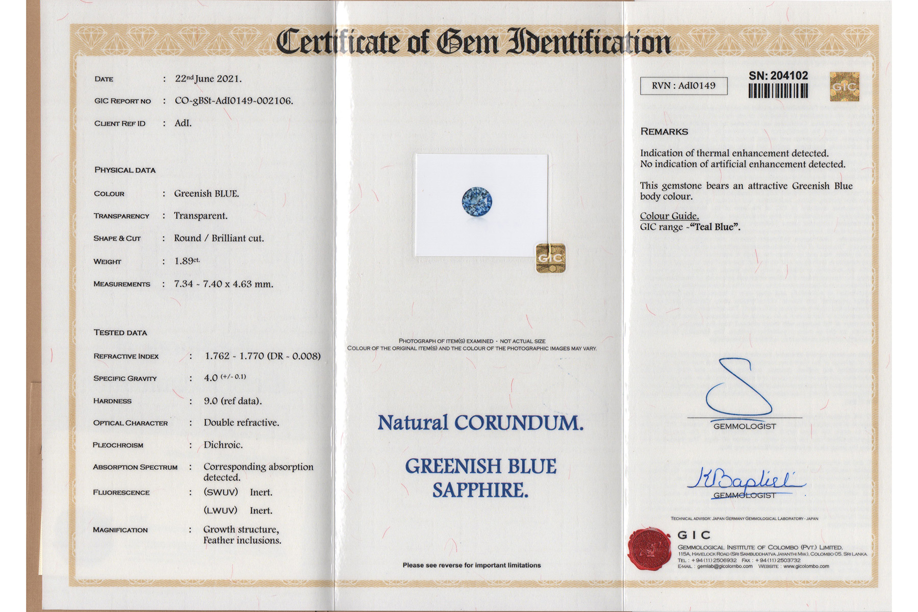 A full format lab report is included with the stone stating standard heat without diffusion