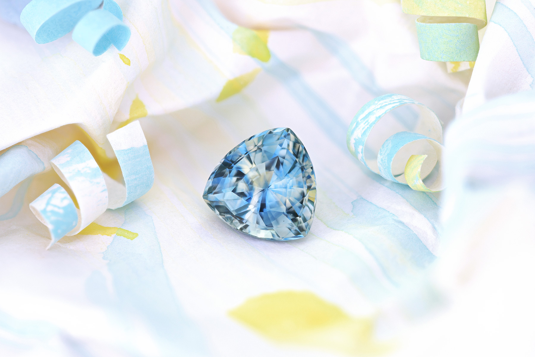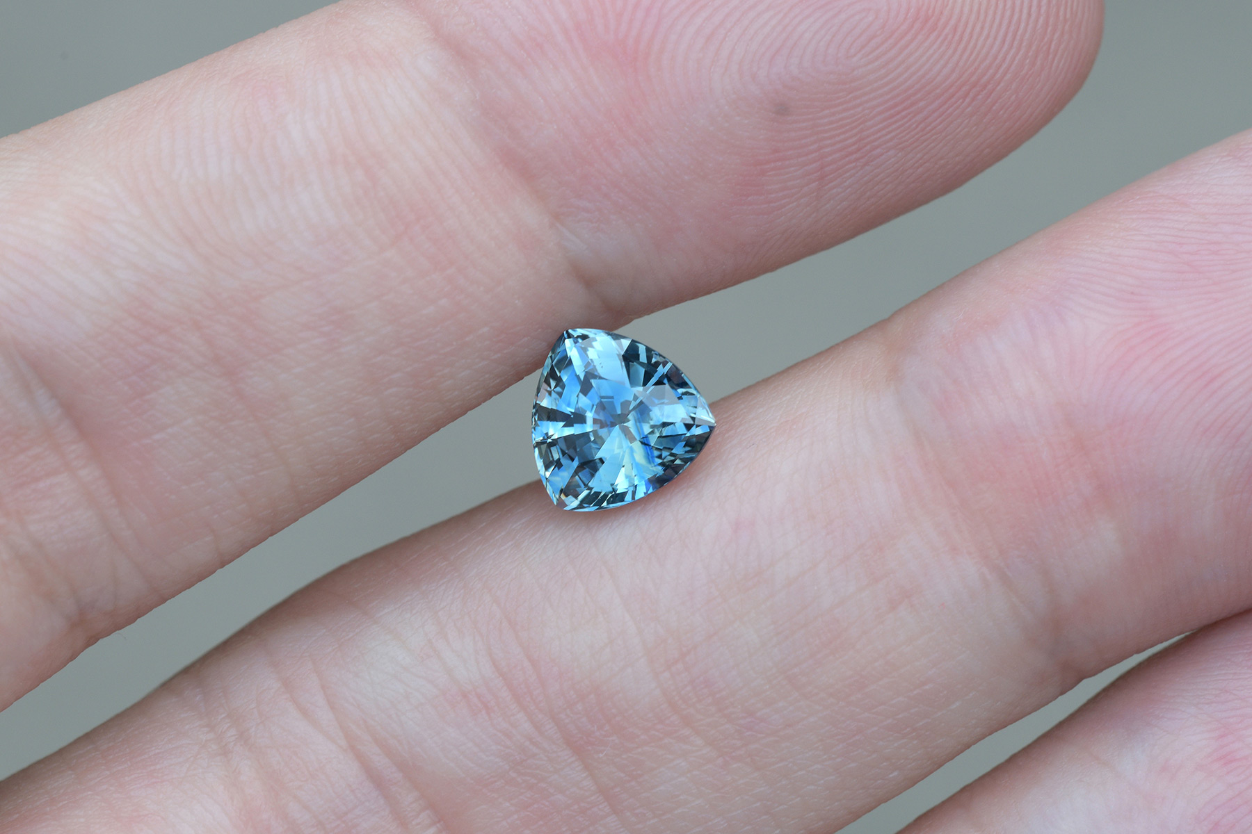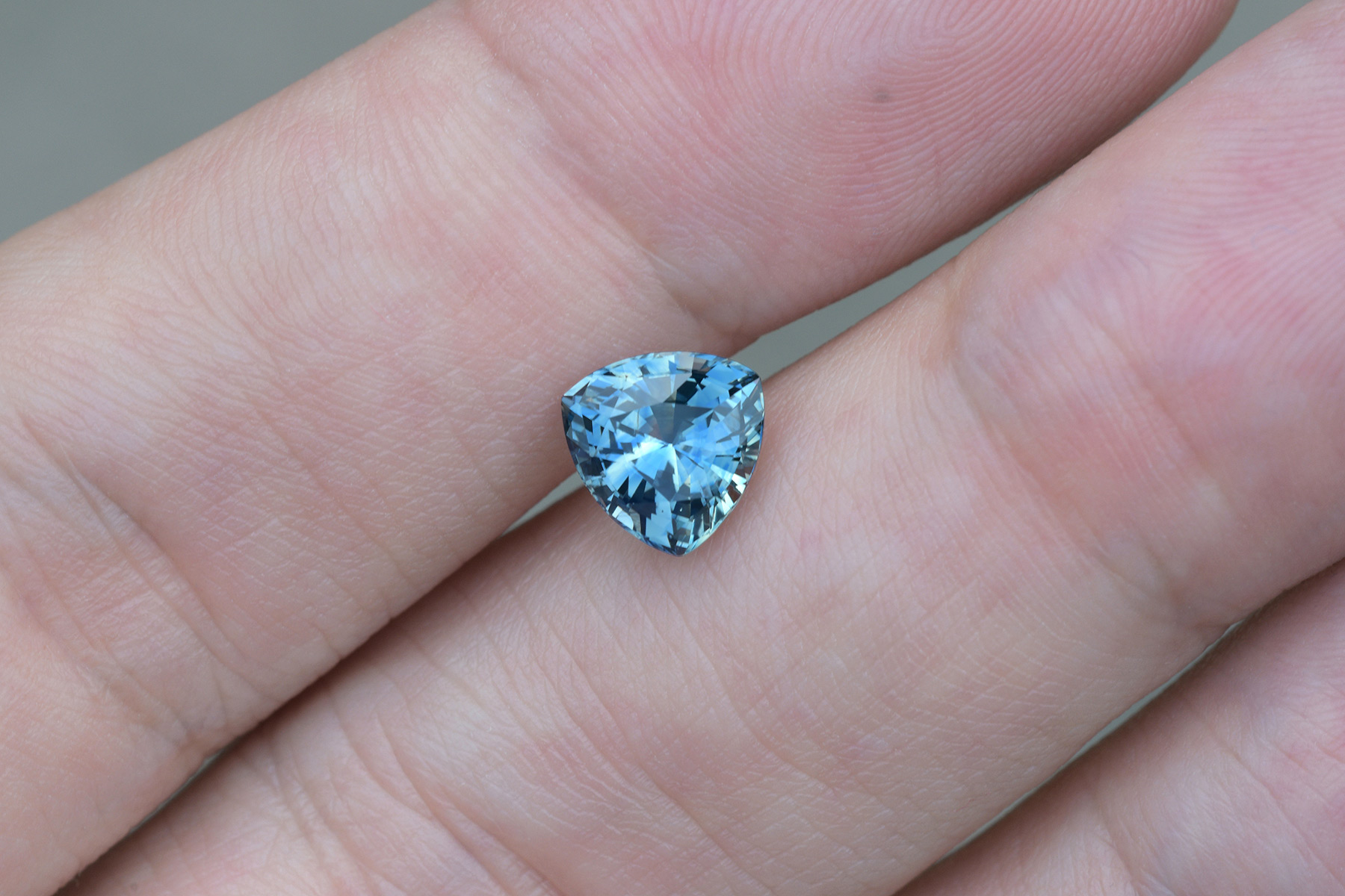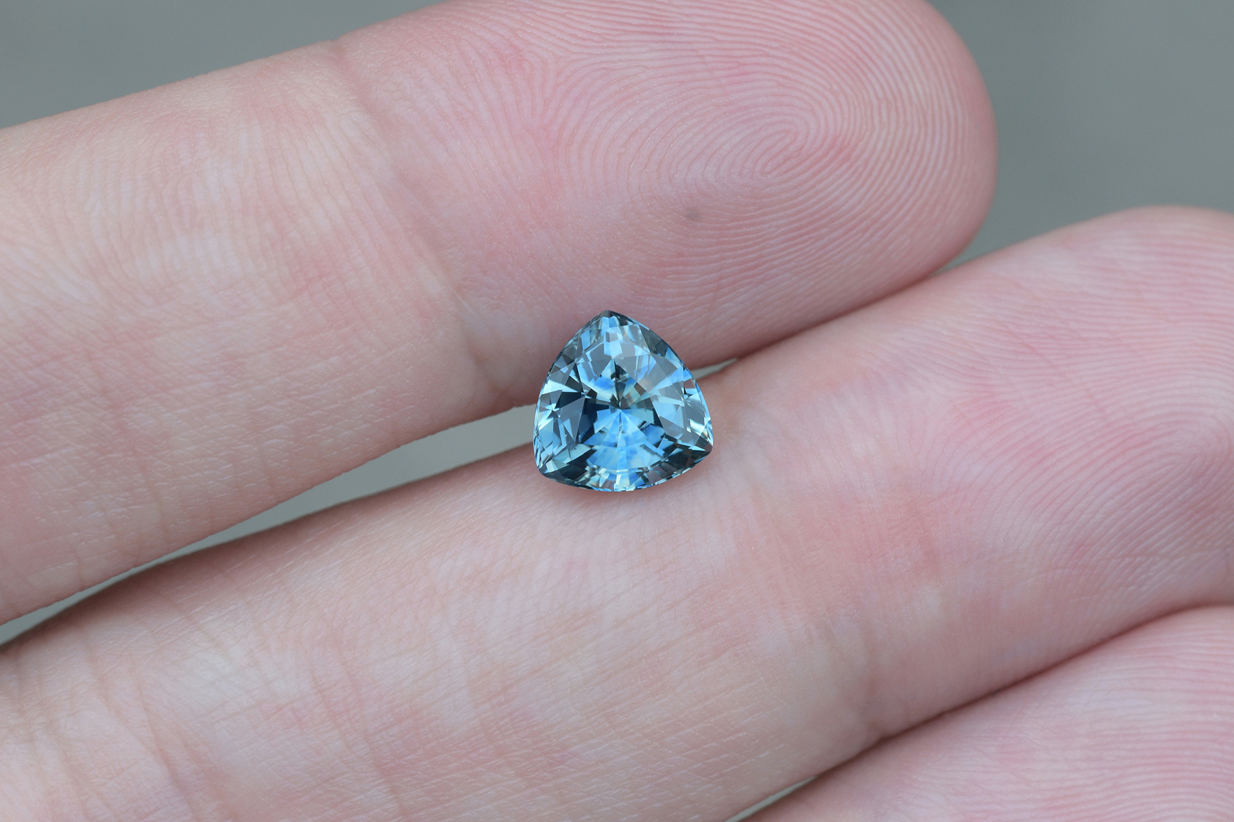 A bi-color sapphire cut from a 6 carat piece of Madagascan rough and made into a beautiful trillion cut. The stone has plenty of brilliance and brightness, with flashes of blue, greenish blue and yellow all mixed together.