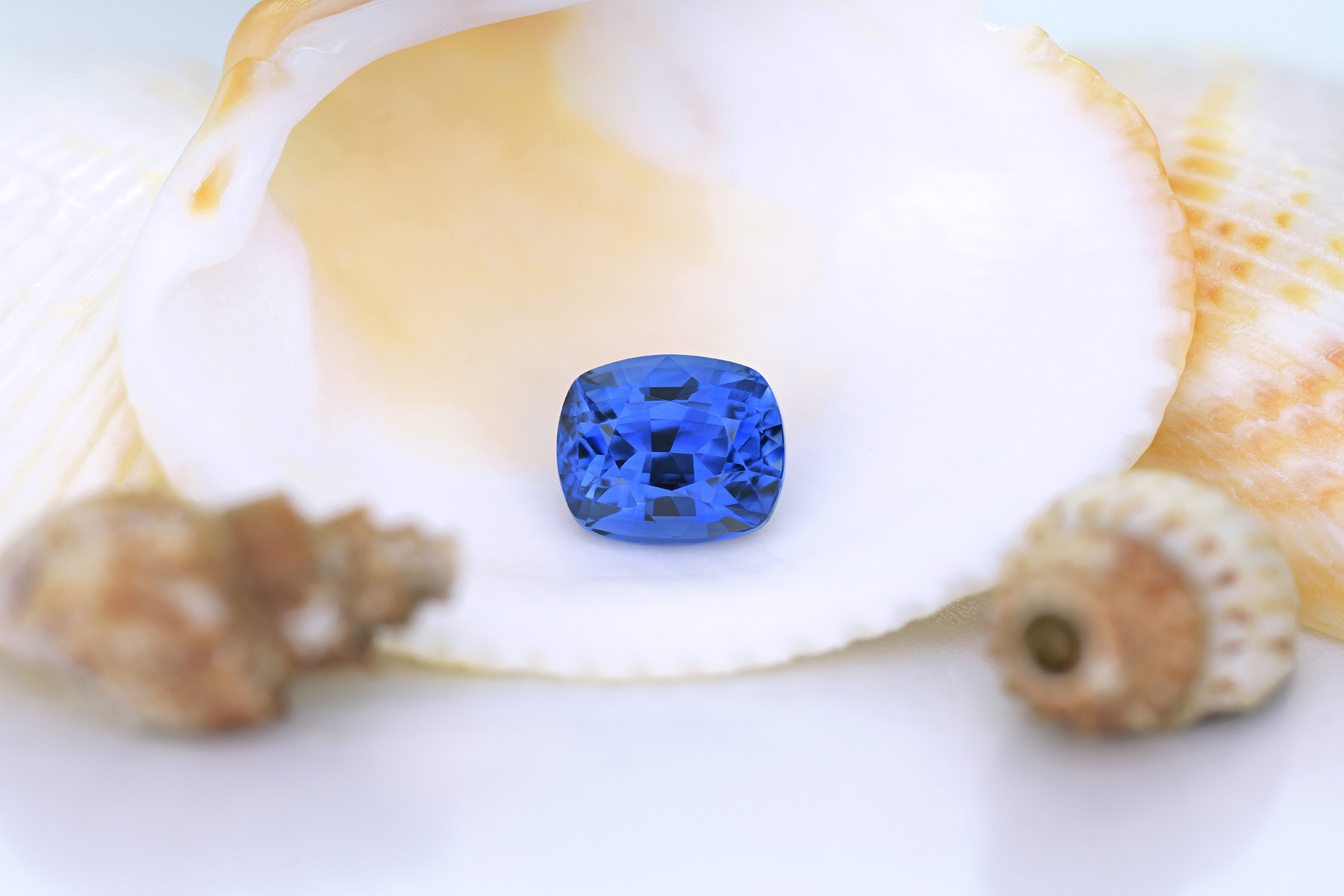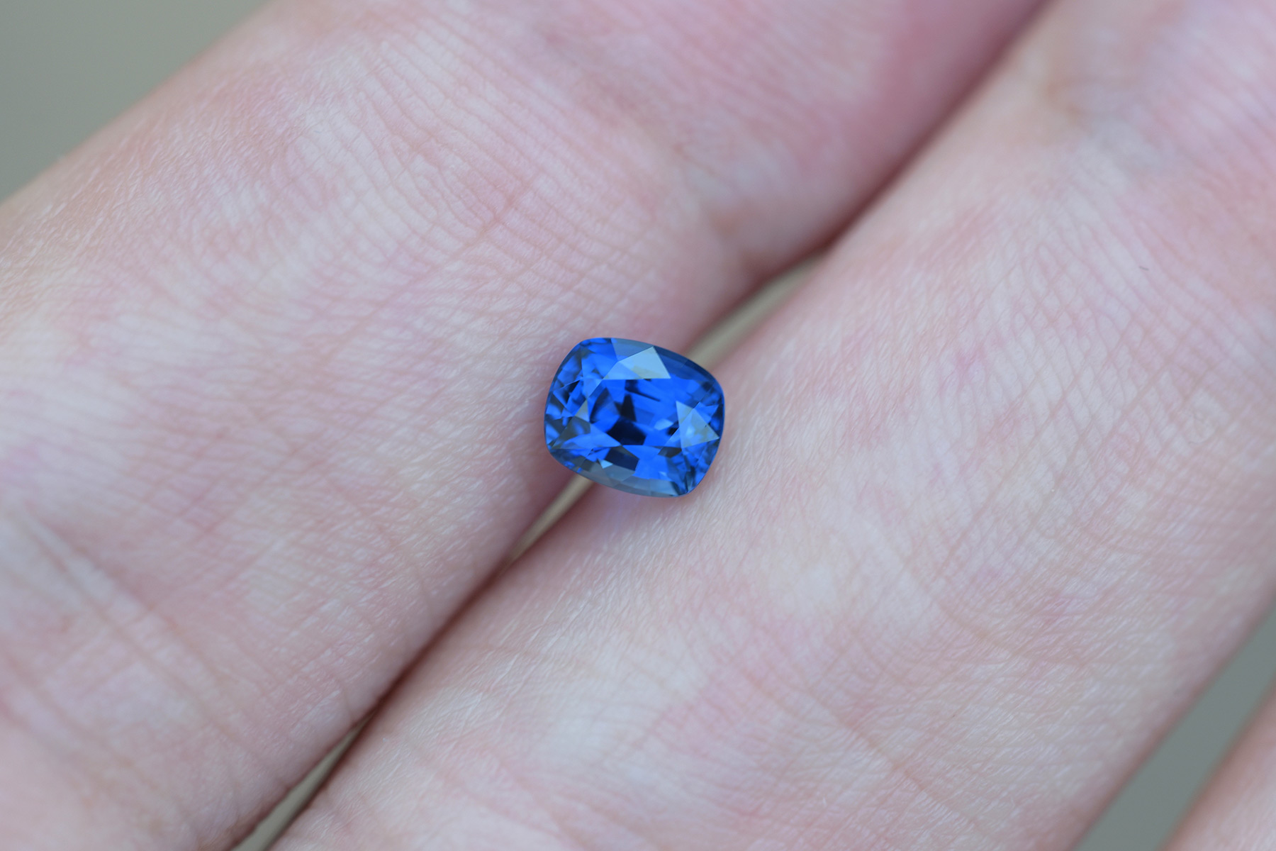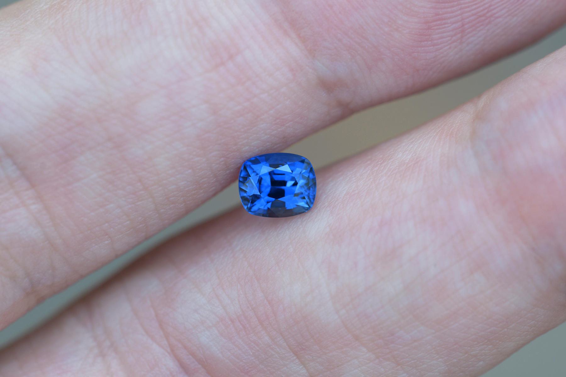 A well cut, bright and pleasant blue sapphire on the brighter end of the “royal blue” range. We’d call it vivid blue. The hue is highly saturated and the stone has no eye visible inclusions.