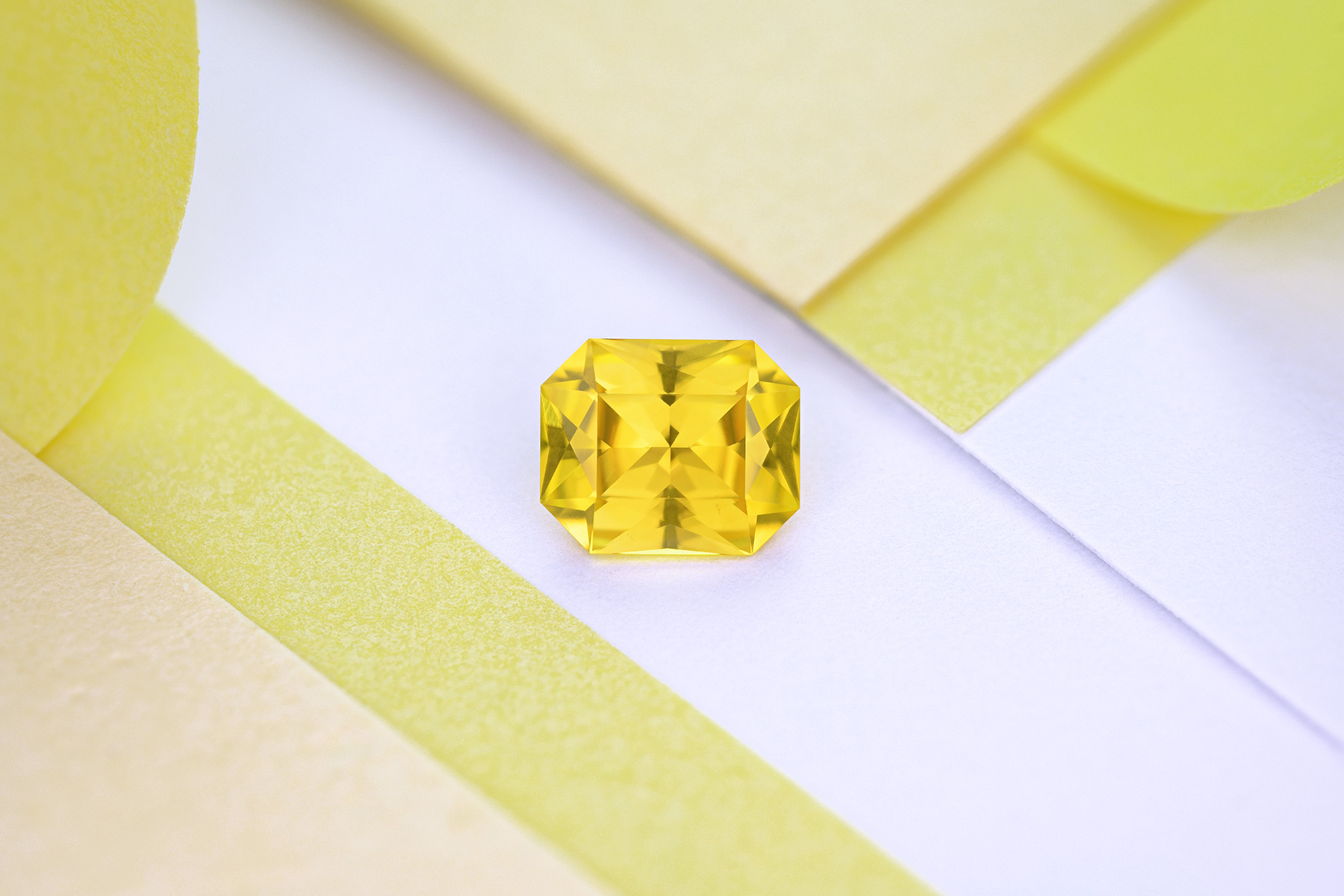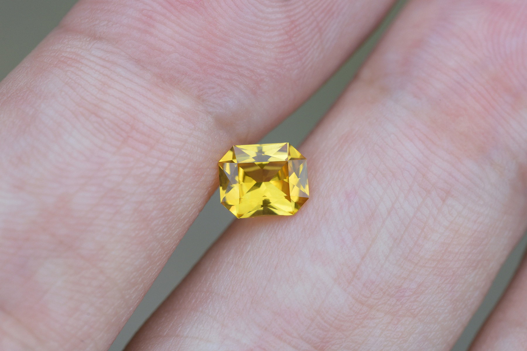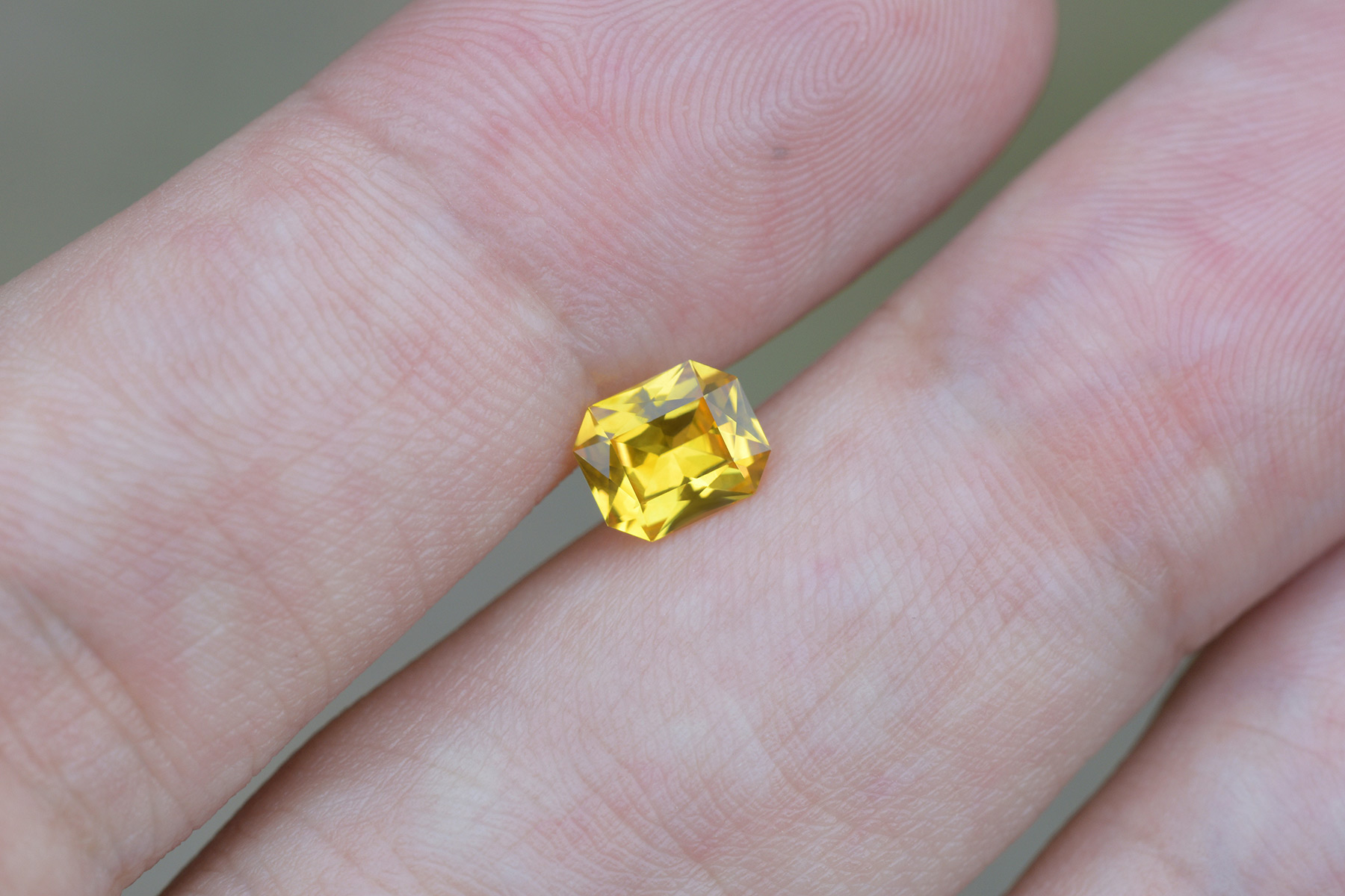 It was cut from a 2.84 carat piece of rectangular rough found in a river in Ratnapura and - like almost all of our yellow sapphires - treated by the traditional blowpipe method of low-temperature heating over coals that has been employed by the Sri Lankan gem trade to improve sapphire color for millennia.