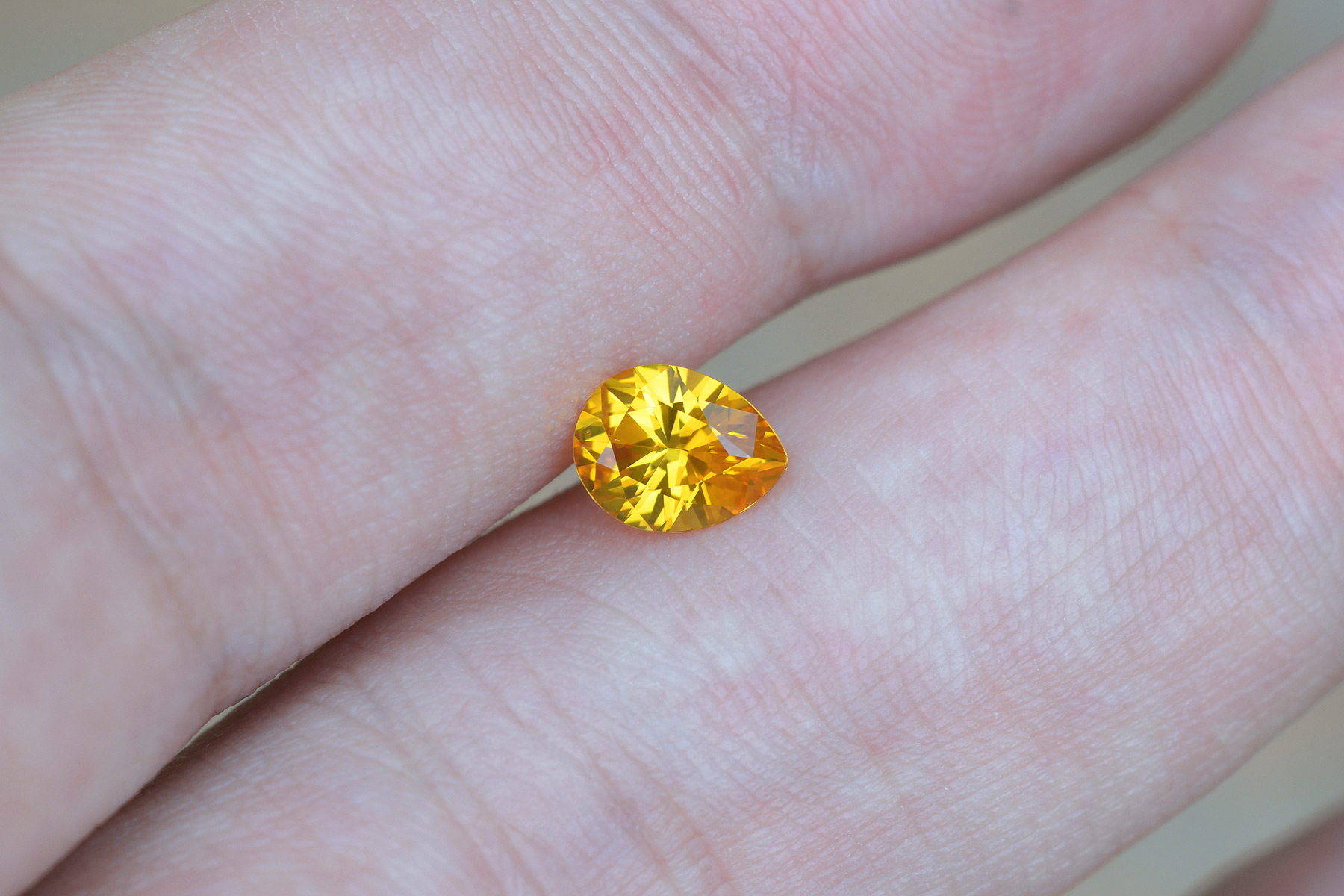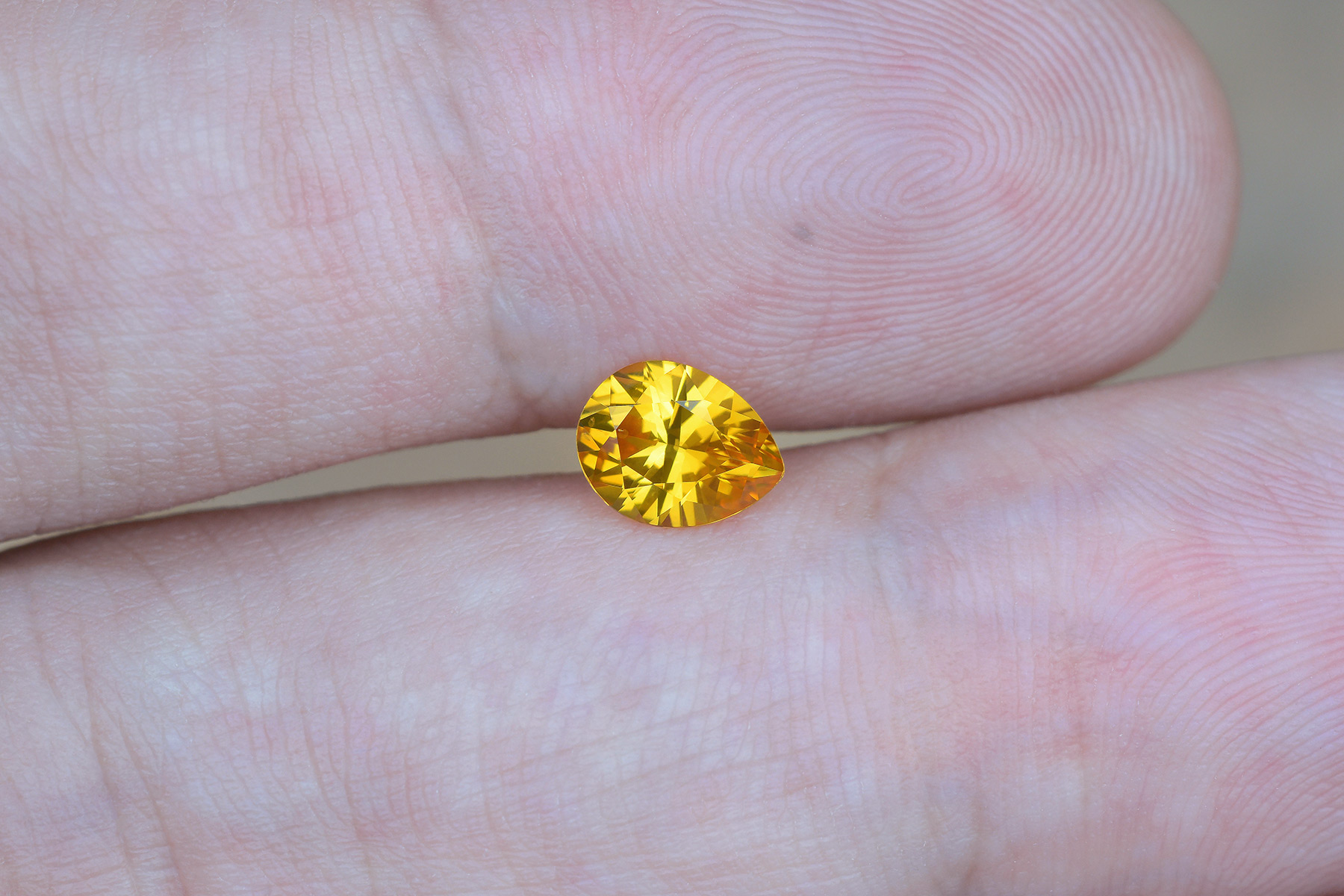 A vividly saturated yellow sapphire in a very well made pear shape. Pears aren’t usually the brightest or most sparkly of cuts, but in this case the cut really does the color justice – it lights up well and looks bright and sparkly.