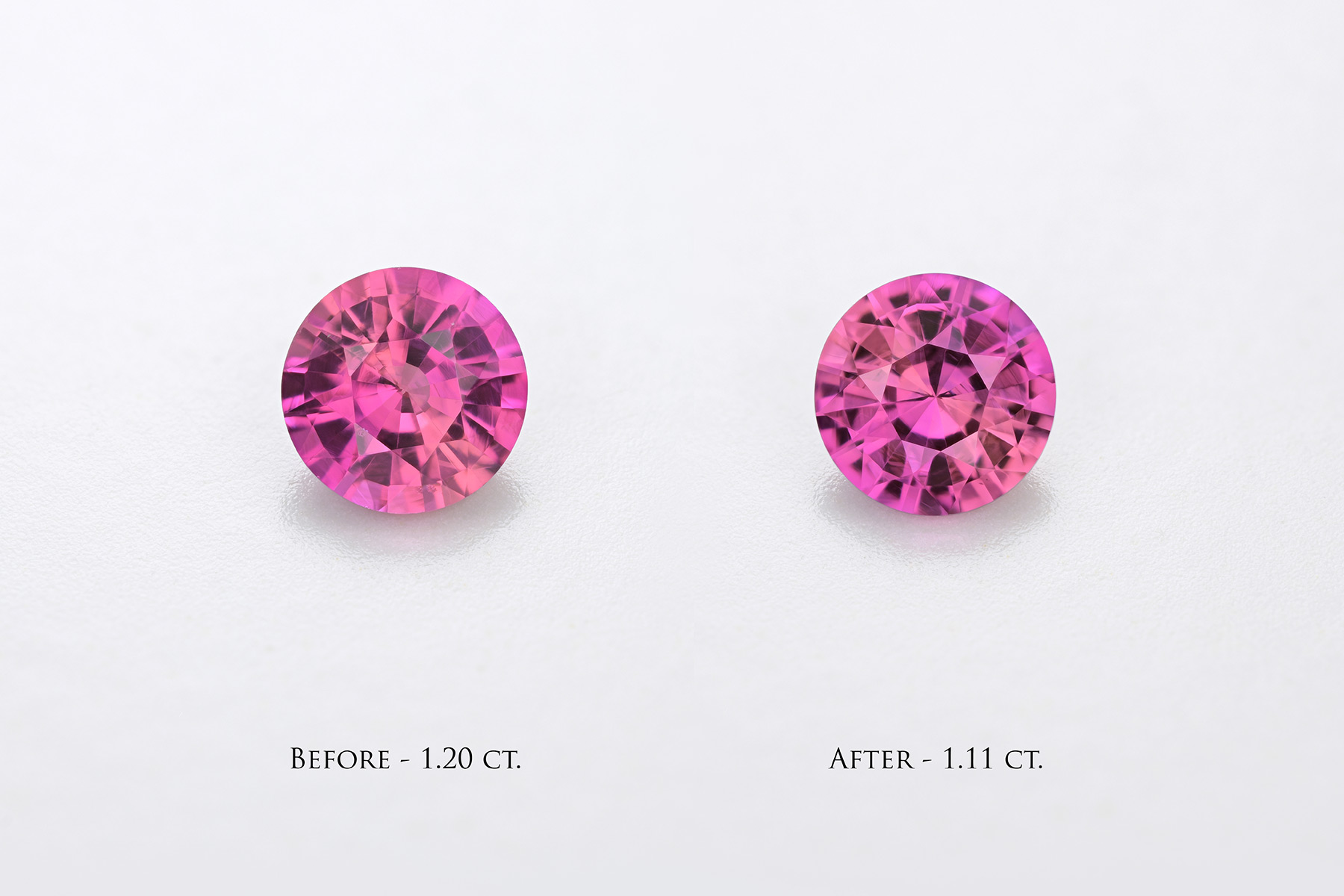The stone is bright, brilliant and has saturation to spare. Its pink and orange components are vivid and beautifully blended, and it looks well cut and polished after its recut.