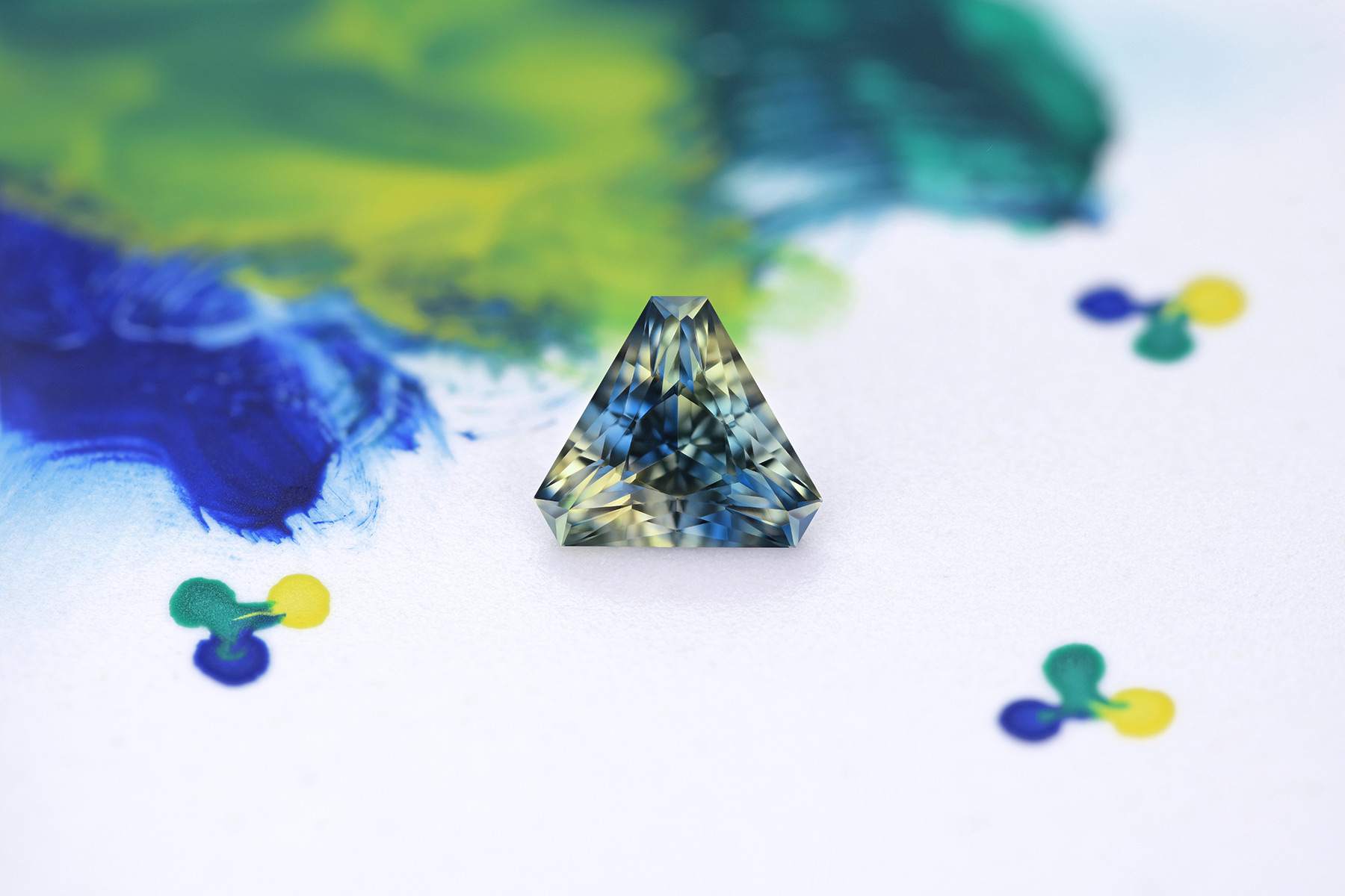 This stone is a cornucopia of blue, yellow and green – it has blue, cyan, greenish blue, navy blue, yellow, greenish yellow and forest green all coming together in a single gem. The middle is slightly darker than the surrounding areas.