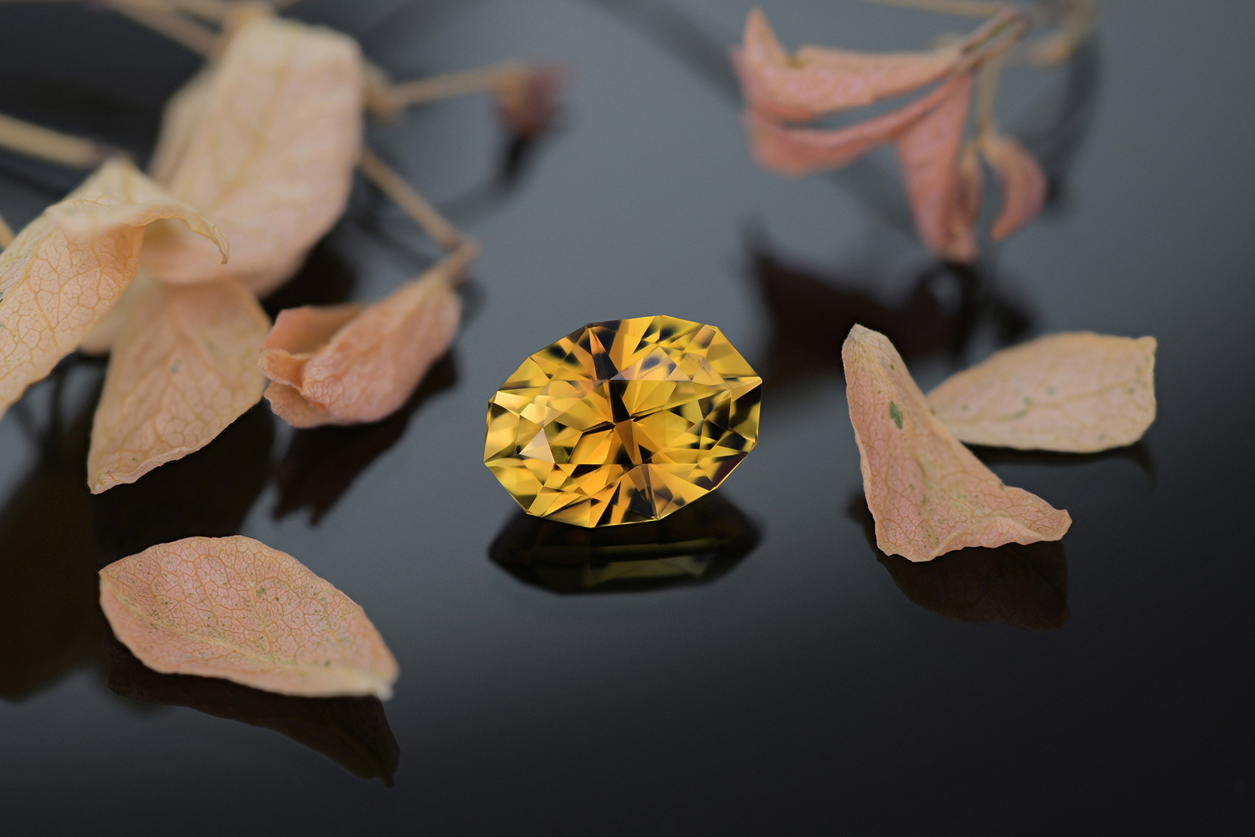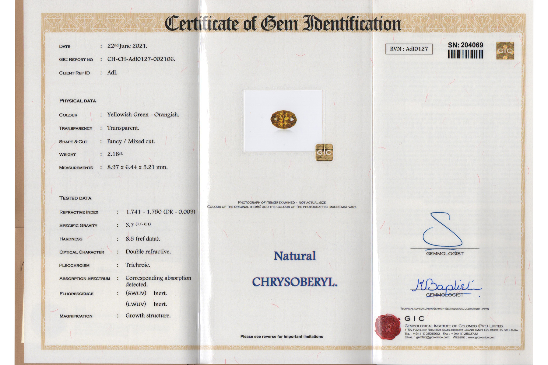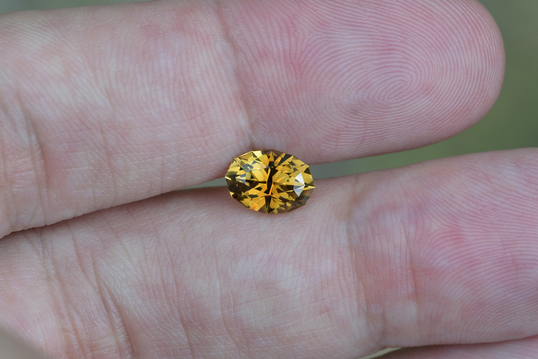 Its color is a mixture of brown, yellow, orange and even a hint of green. Chrysoberyls with these super-bright, clean looking hues are extremely rare without chatoyancy – plenty of drab, dull looking brown/yellow mixes are cut into faceted stones, but bright and lively colors of this type are almost always cut as cat’s eye cabochons rather than faceted.