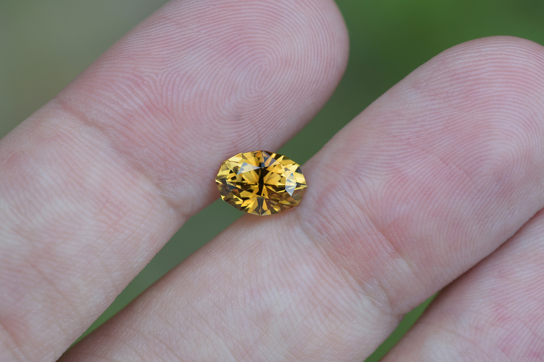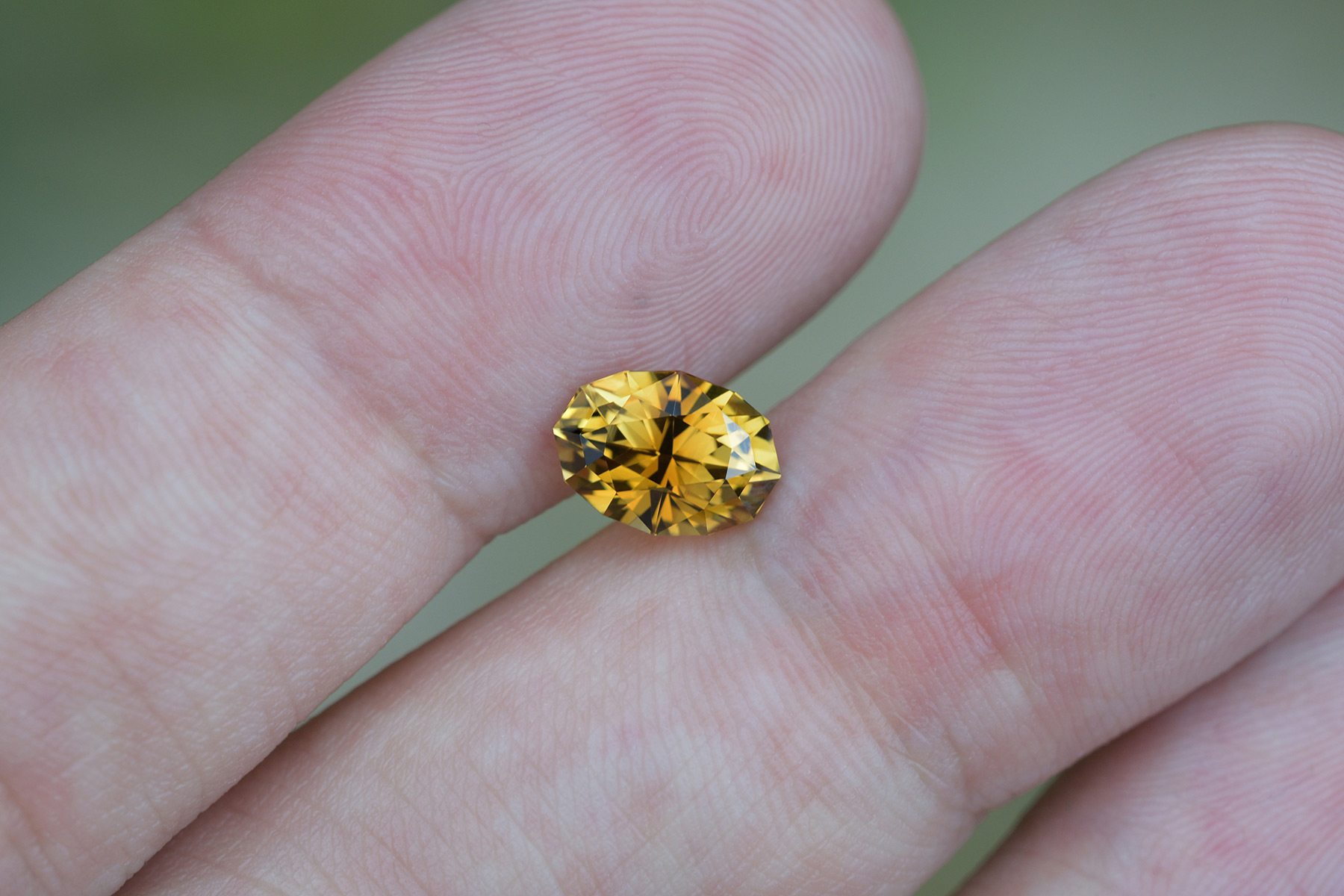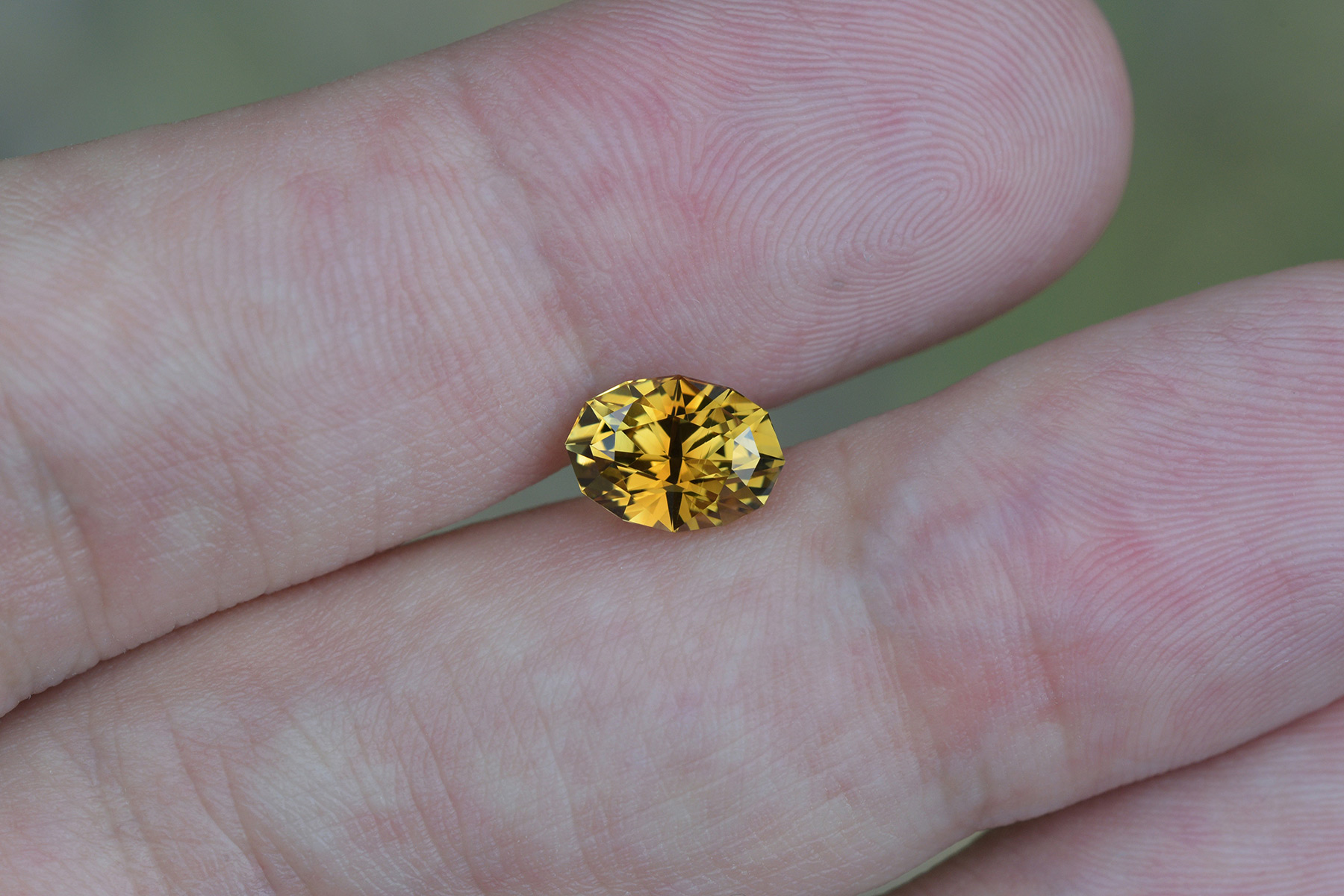 On top of the color rarity factor, the stone is completely eye clean, very brilliant, and cut into a sharp looking barion that really didn’t spare rough weight: the initial rough was a 6+ carat oblong river-mined pebble. The choice was to either make a conventional 3 carat oval or a barion, but since colors like this in chrysoberyl tend to look phenomenal in sharp, straight, angular cuts, this particular barion design made more sense.