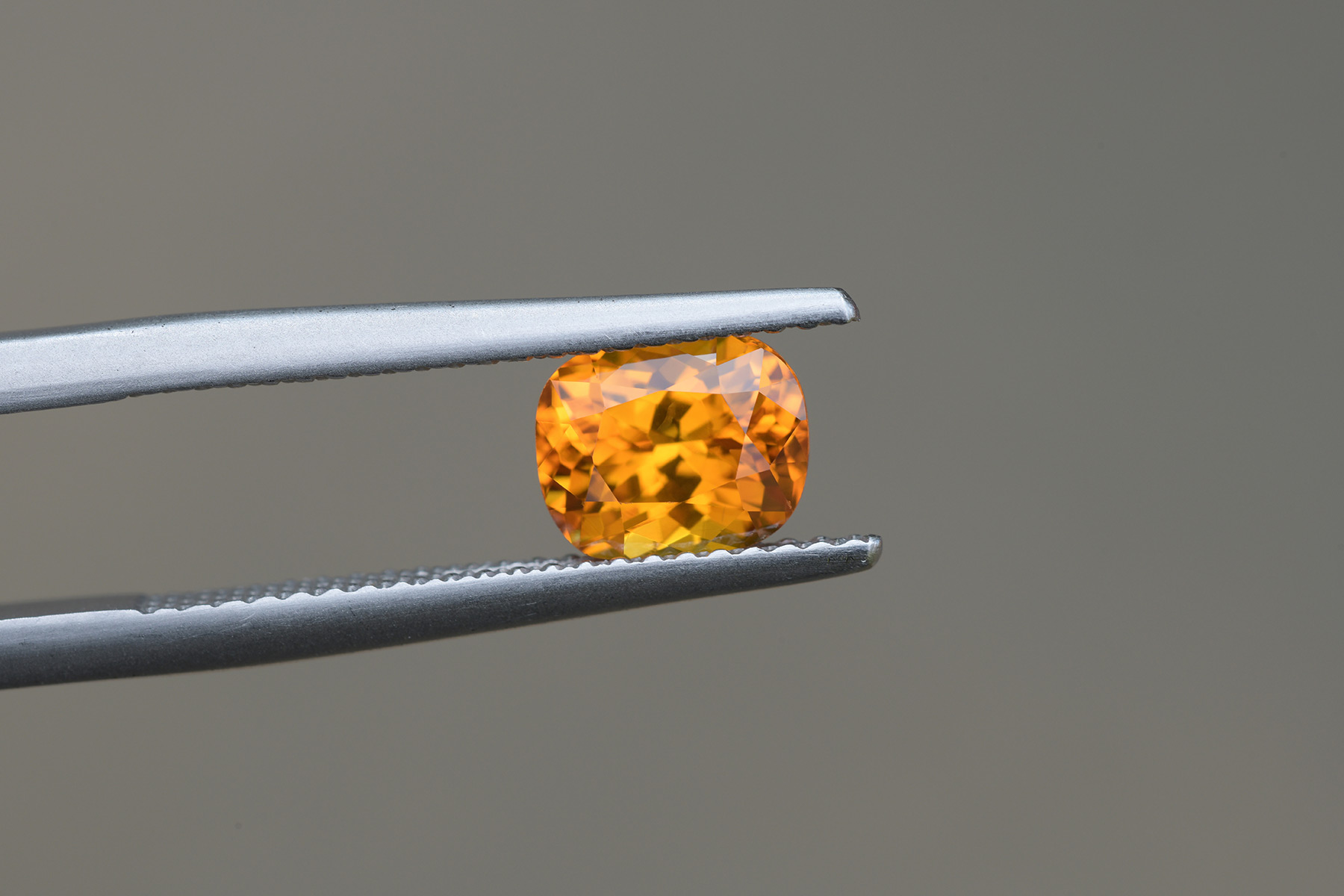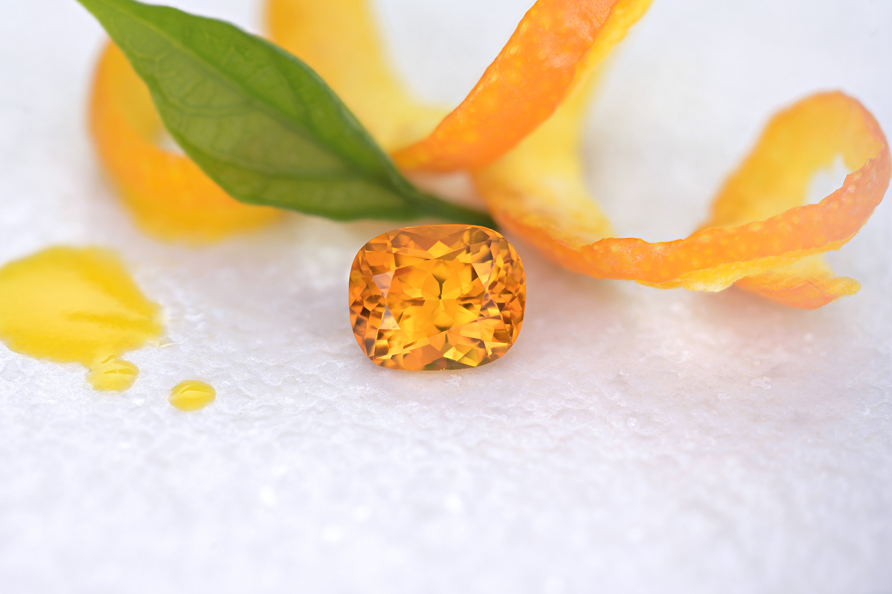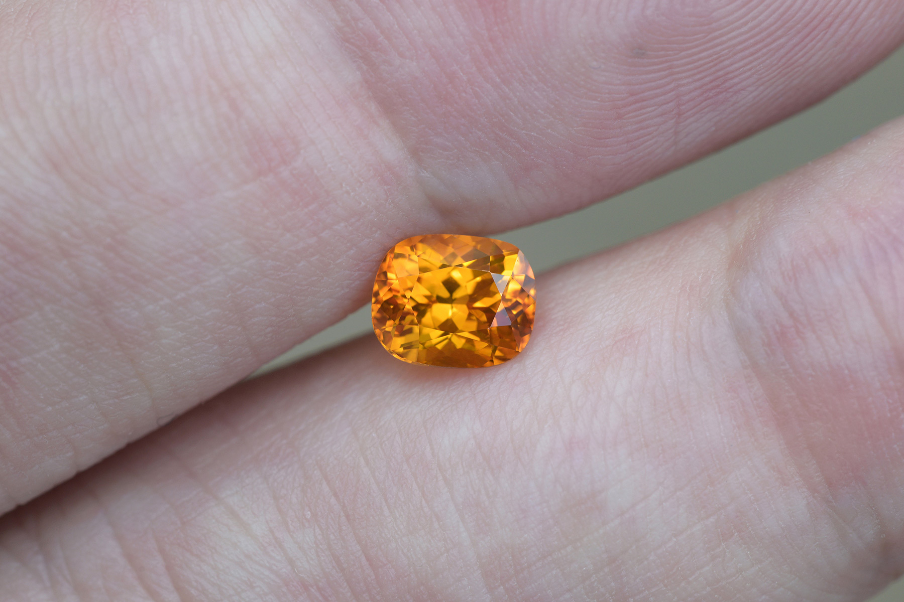 A sparkly and intensely saturated orange sapphire. The sides show a deeper, reddish orange hue while the middle stays more yellowish orange but the transition is seamless and quite pleasant to the eyes.