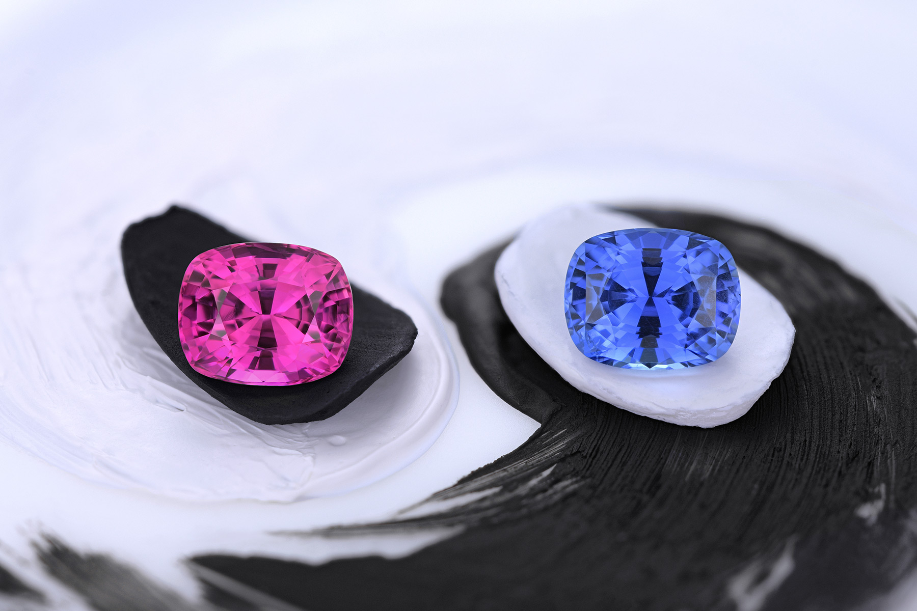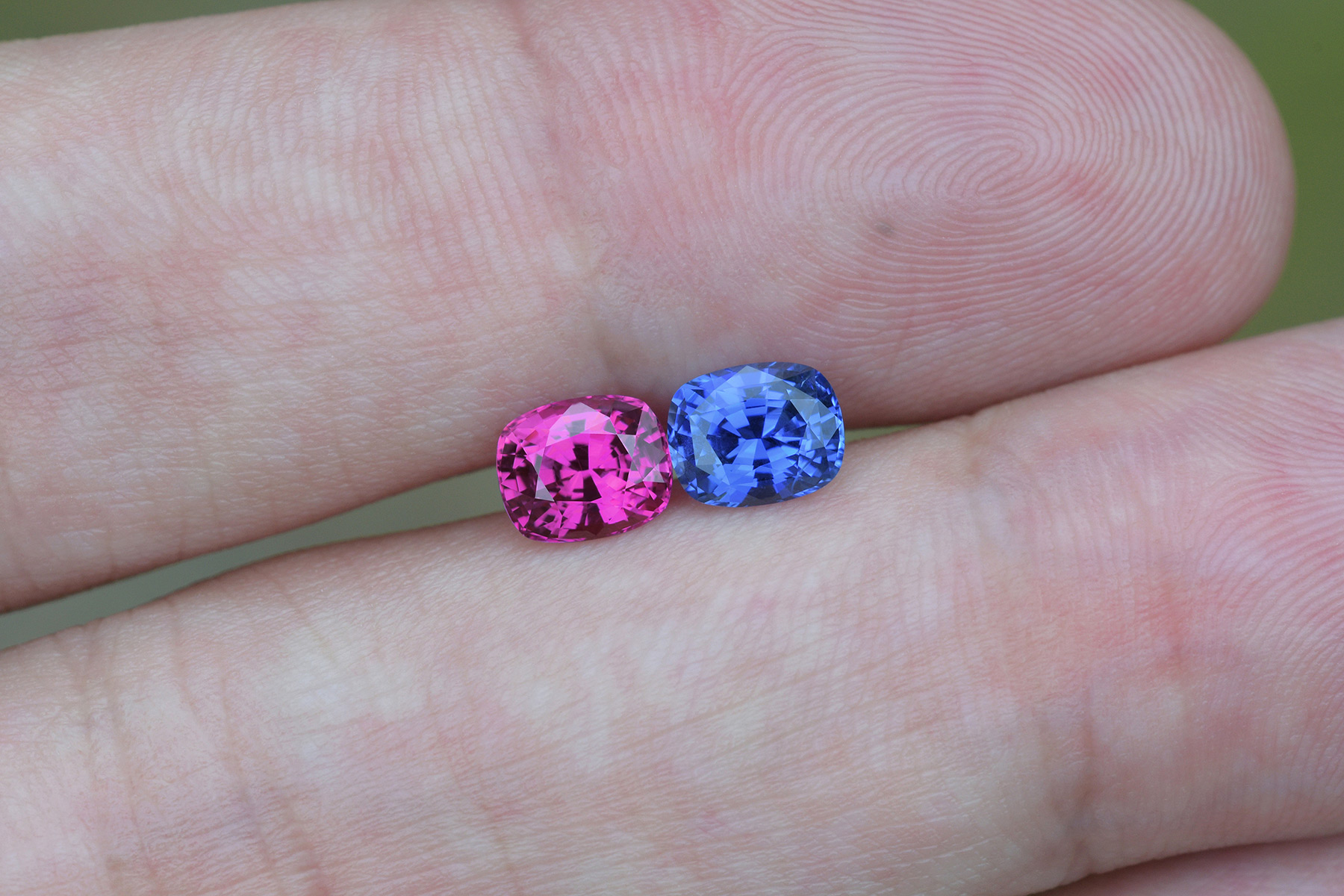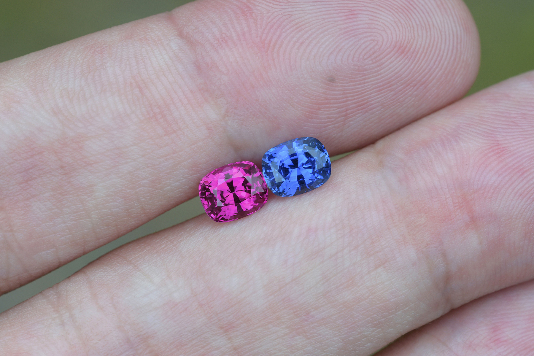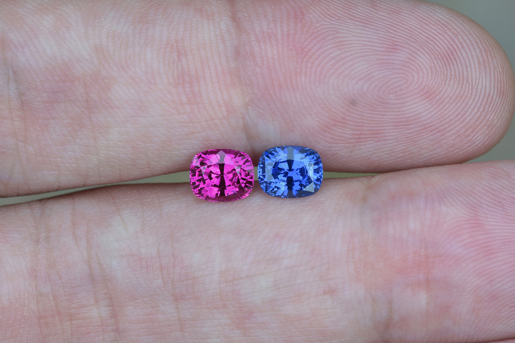 Like all of our stones, these also required recutting to make them look proper and match them better: the pink was recut from 1.42 to balance its symmetry and the blue was recut from 1.35 for the same reason, as well as to improve its light return.