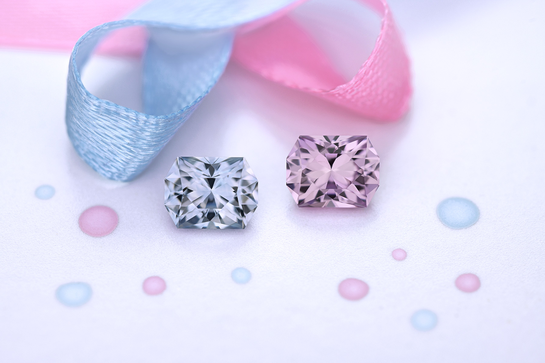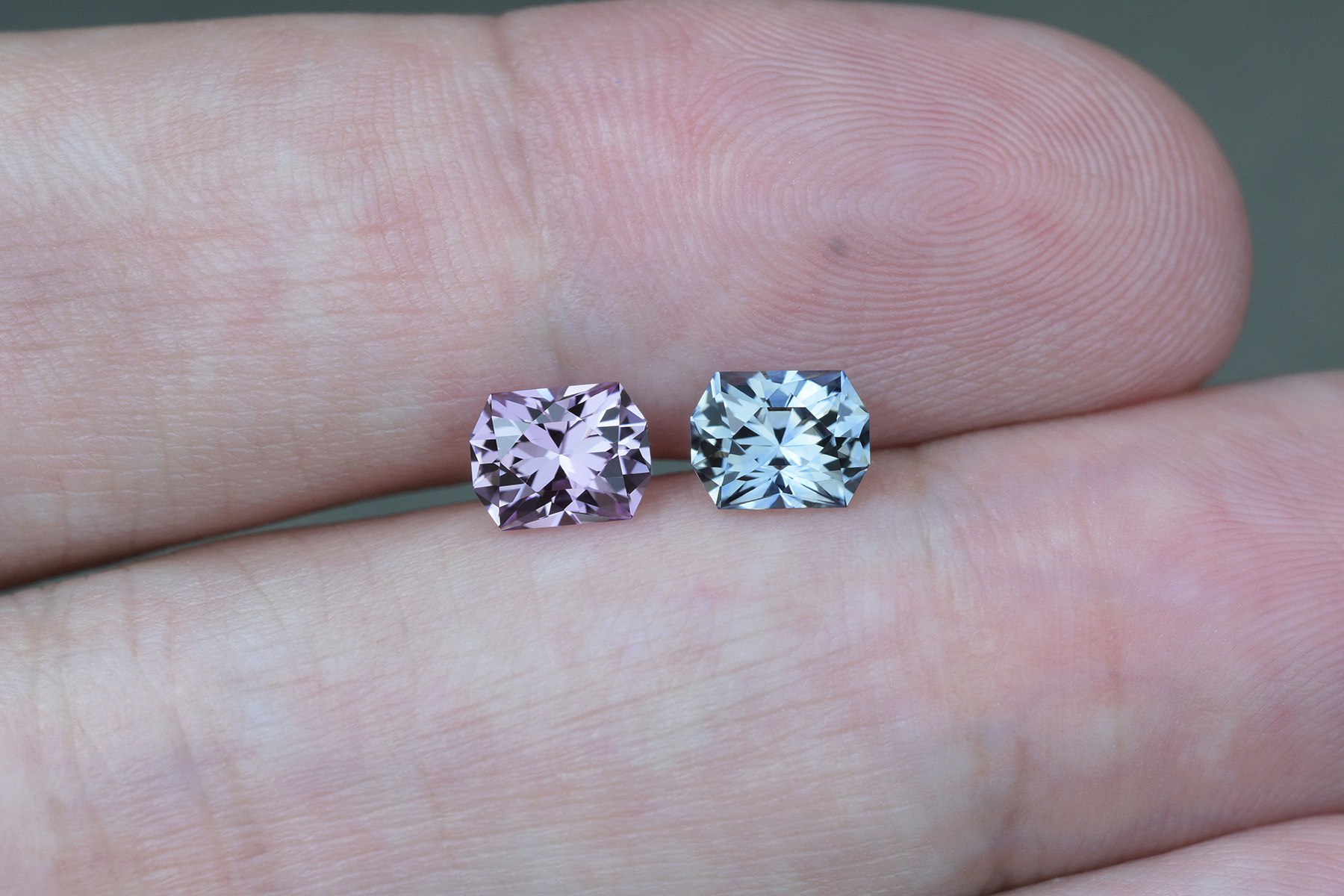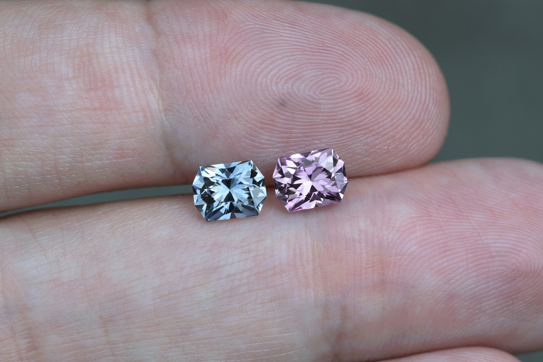 They were initially cut out of Madagascan rough into two completely separate stones and it was only when we put them next to each other that we realized they could have been a pair, so we had the larger pink cut again to match the blue. Now they match very well in size, and the two different colors go together beautifully despite the different hues because they’re matched in tone and saturation.