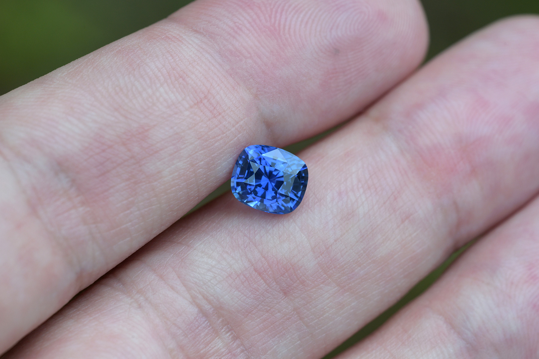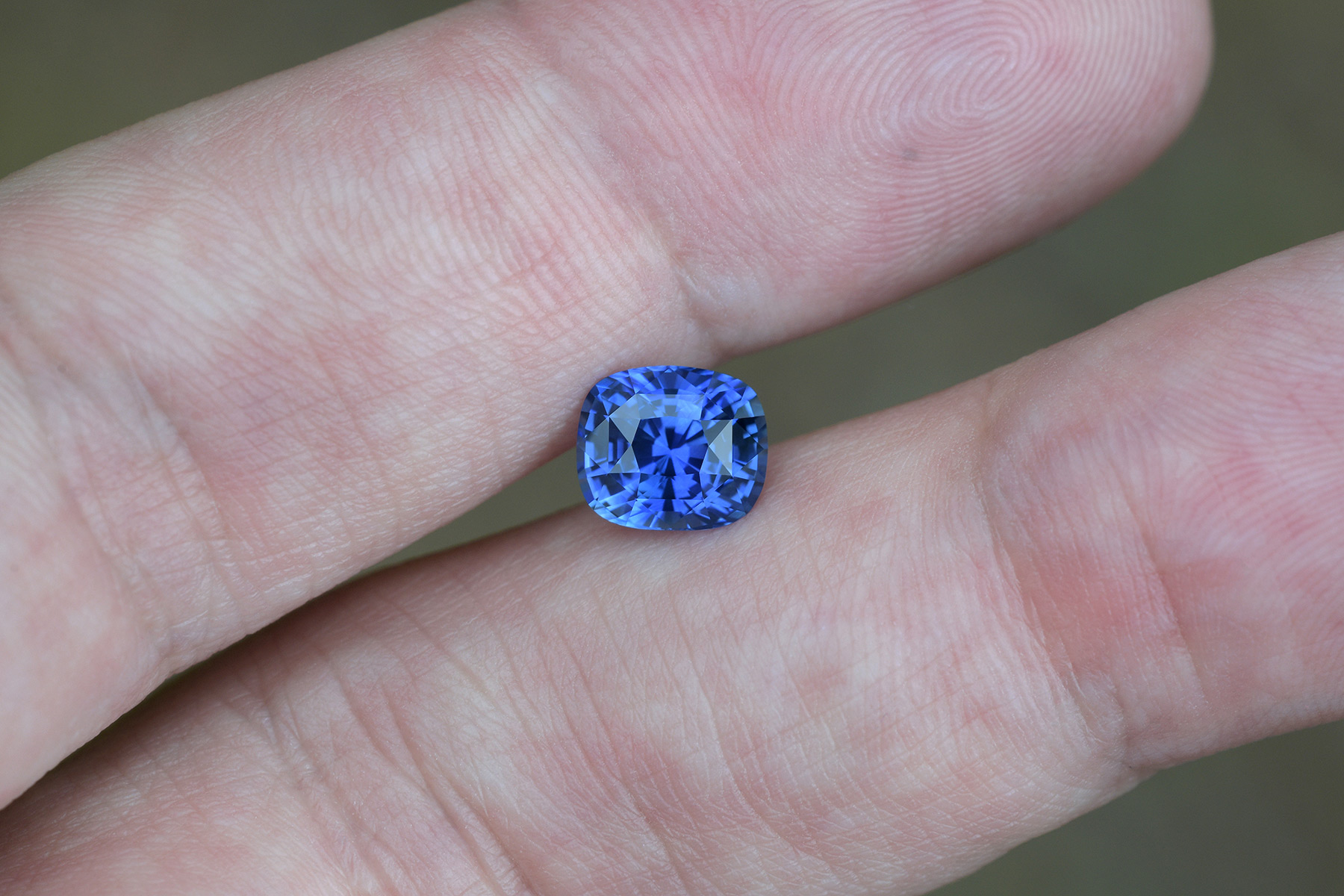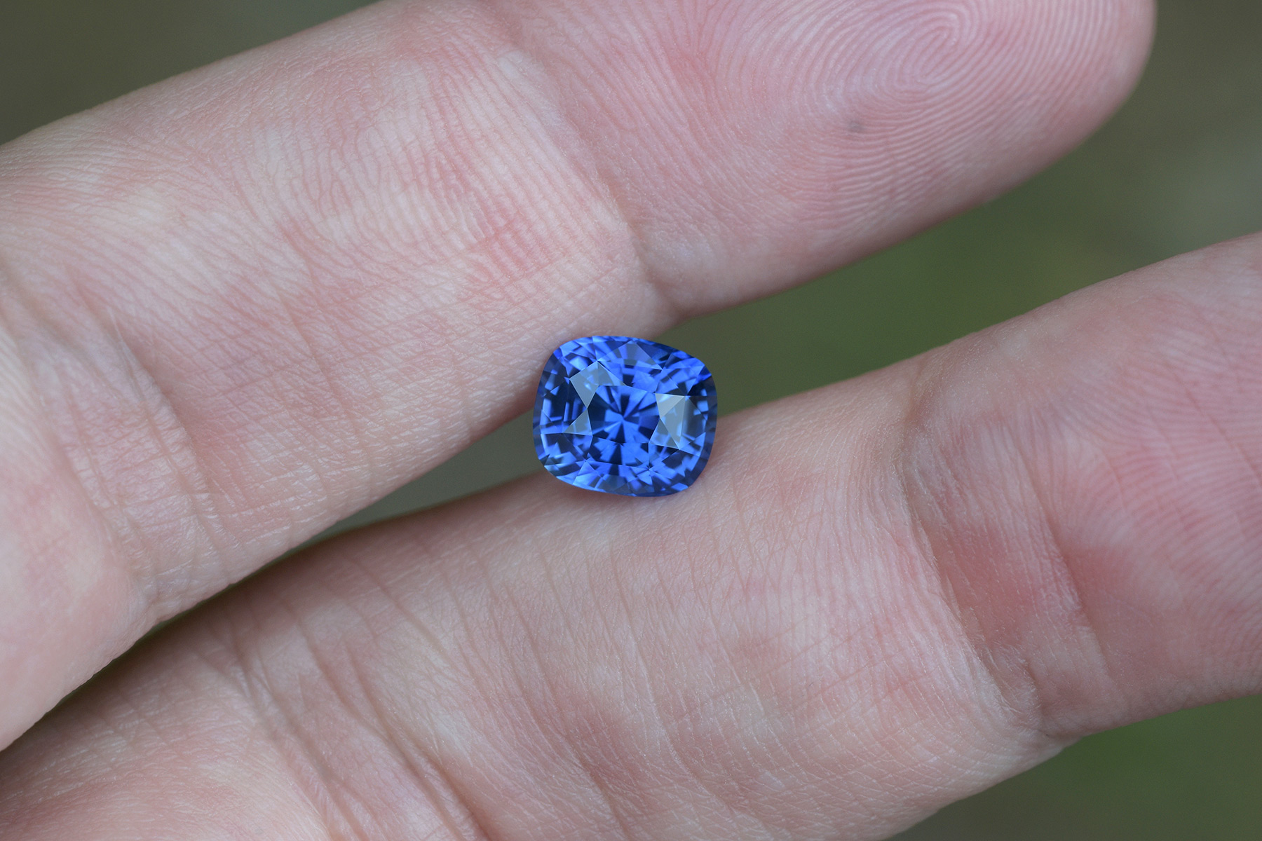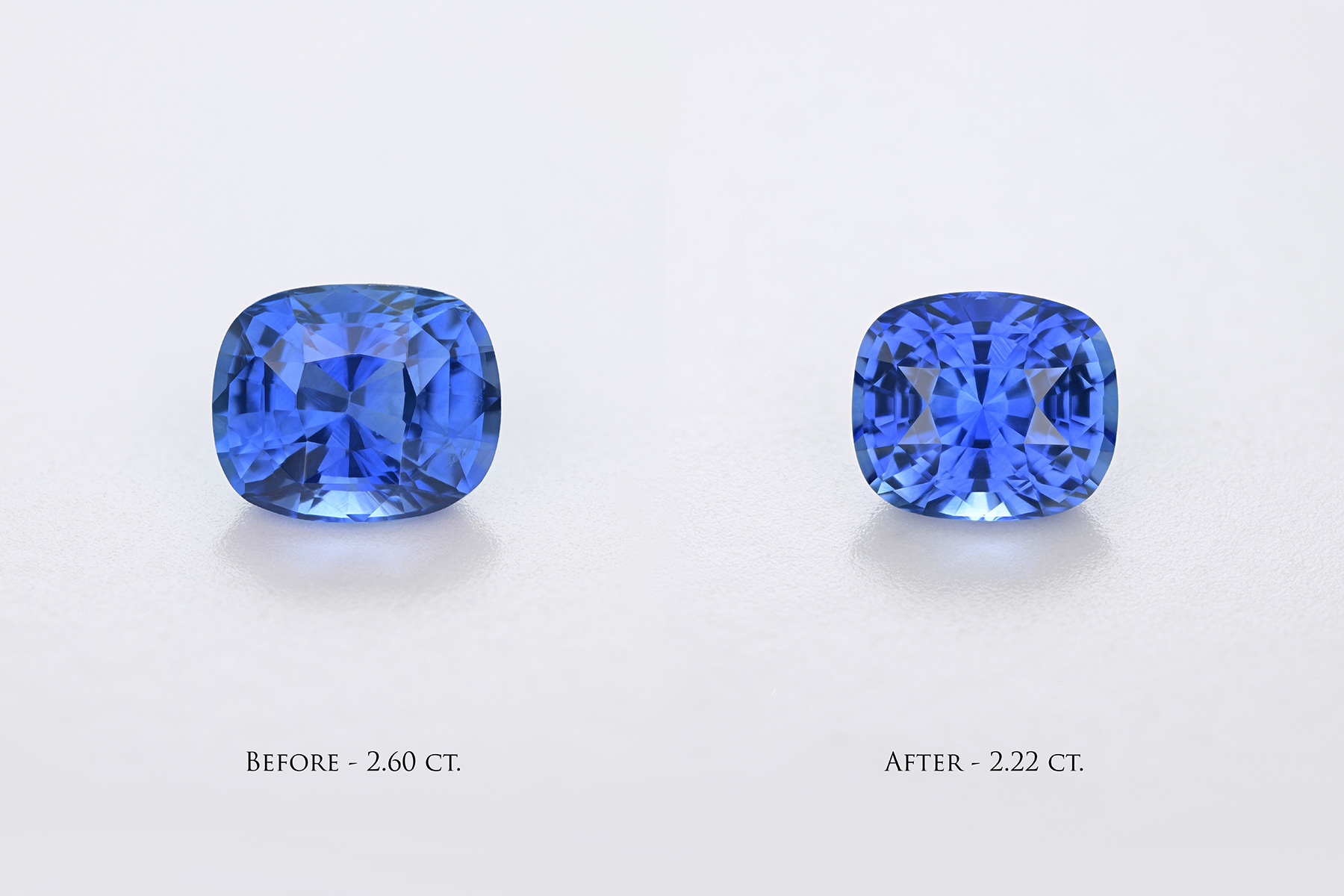 Not only did the stone keep its gorgeous color, but it now also has a cut that’s beyond excellent for a vivid blue sapphire of 2+ carats, and the inclusions that were present near the surface of the pavilion got shaved away entirely so it’s also loupe clean as an added bonus.