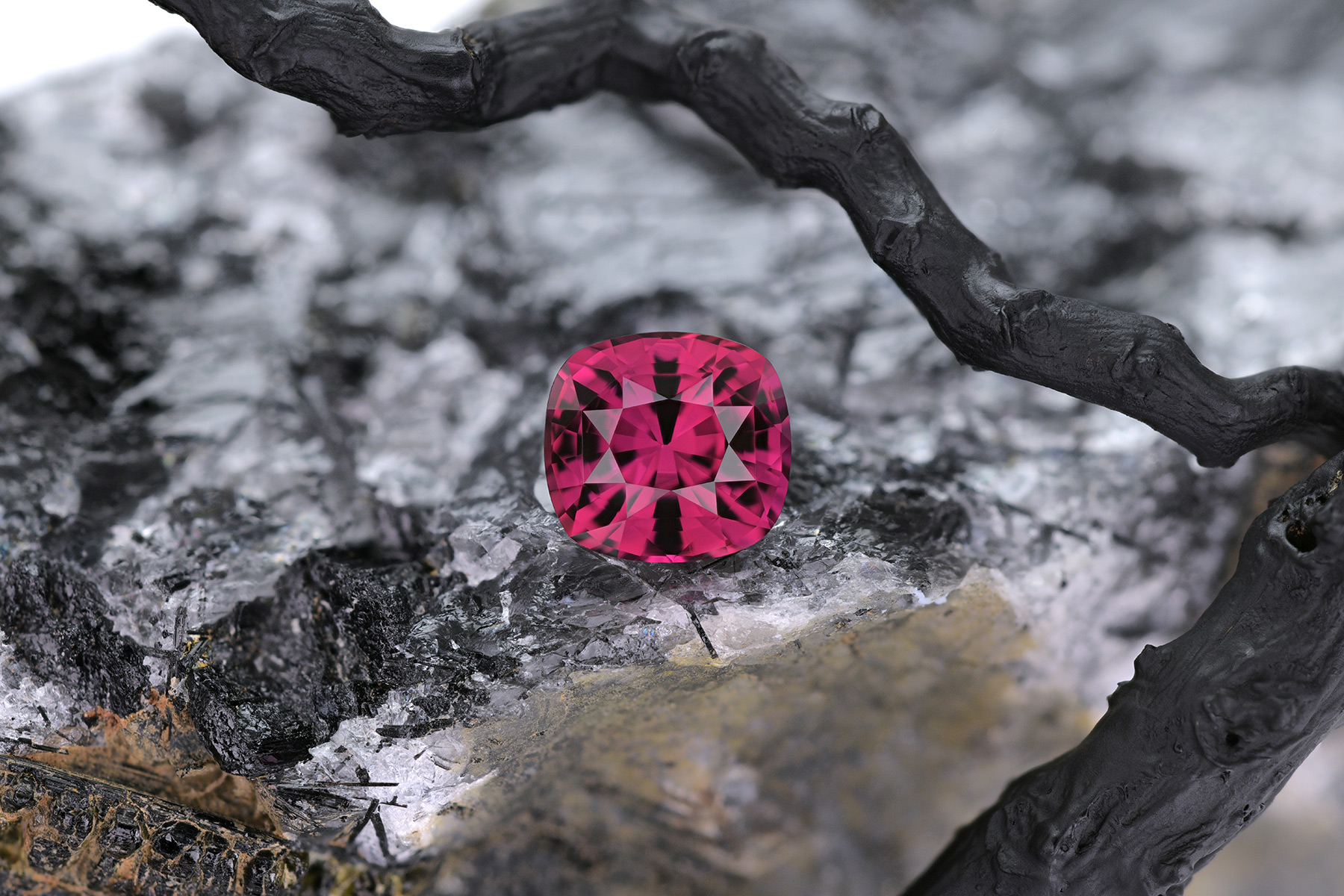 When we first came across it, we weren’t entirely sure what to call it – it’s neither the usual hot pink sapphire, nor a ruby but more of a hybrid between the two with some purple thrown into the mix for good measure.