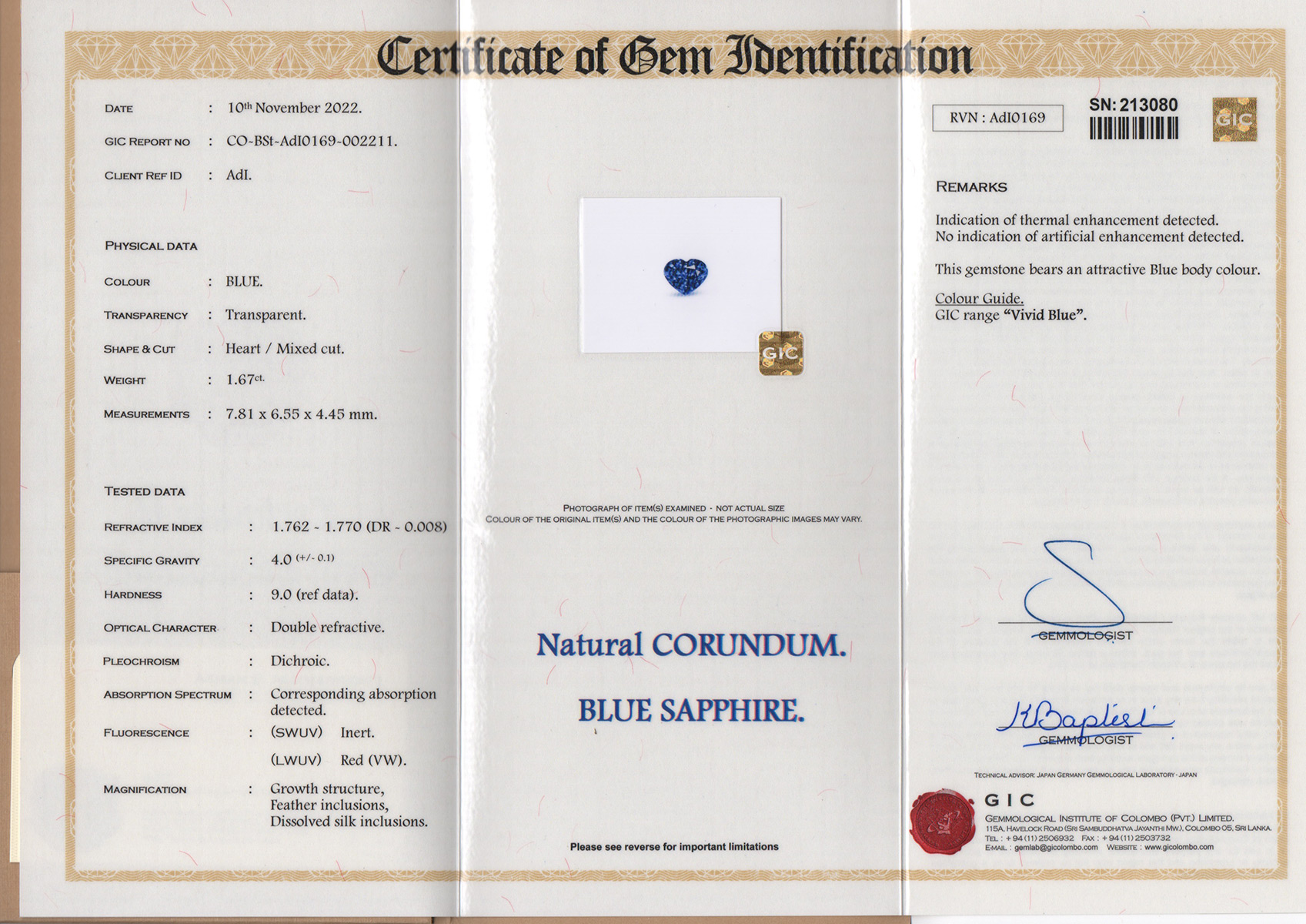 A full format lab report is included with the stone stating standard heat without diffusion