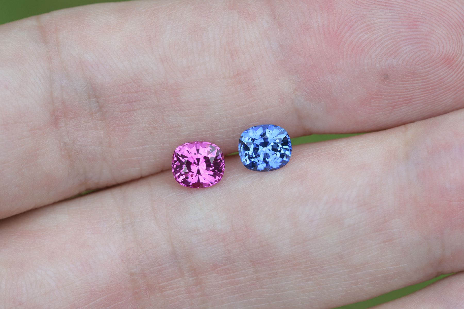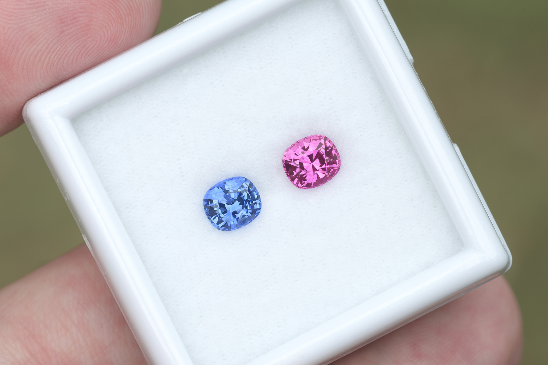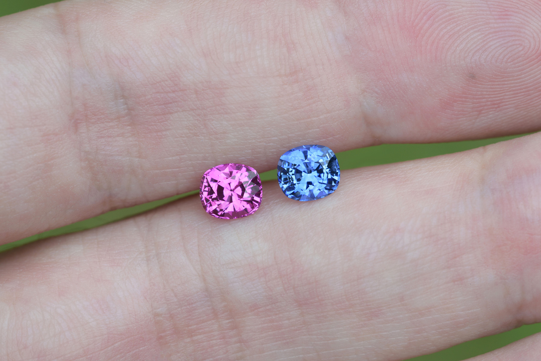 The stones are incredibly well matched, down to just one hundredth of a millimeter face-up width-wise, which is near unheard of for natural hand-cut sapphire pairs.