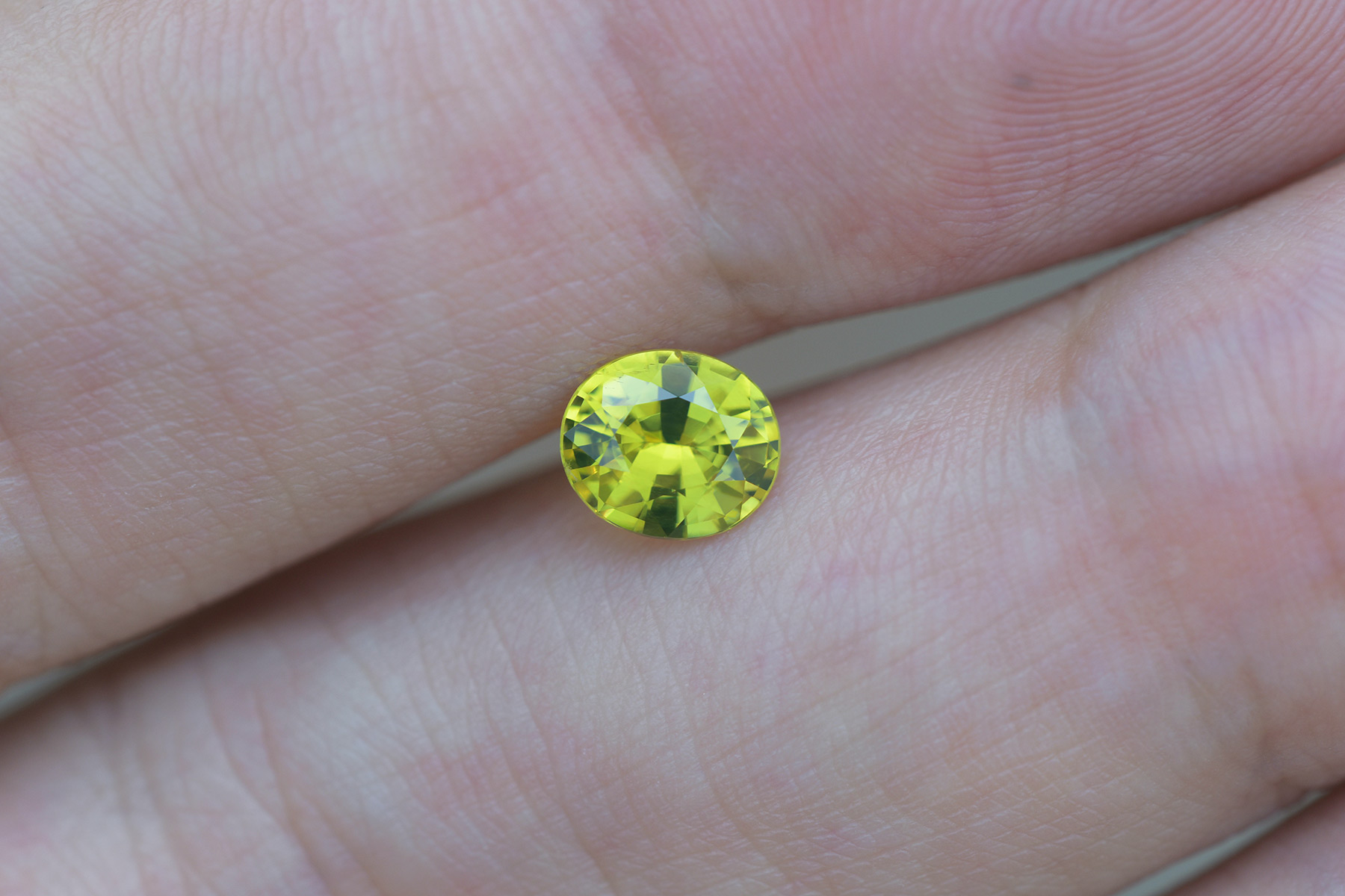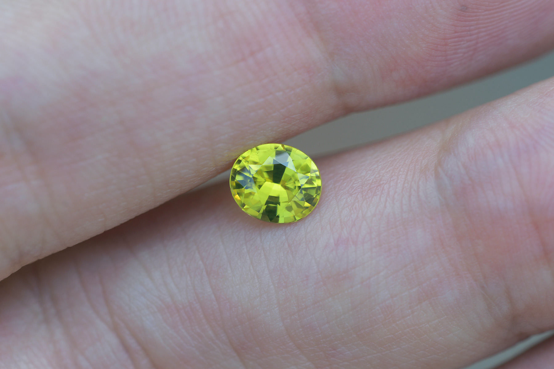 While chrysoberyls cannot reach true “neon” saturations that spinels and other gems like hauyne and Paraiba show, this (and a few others we've had) is about as close as it gets. The stone's color is like highlighter yellow on steroids.