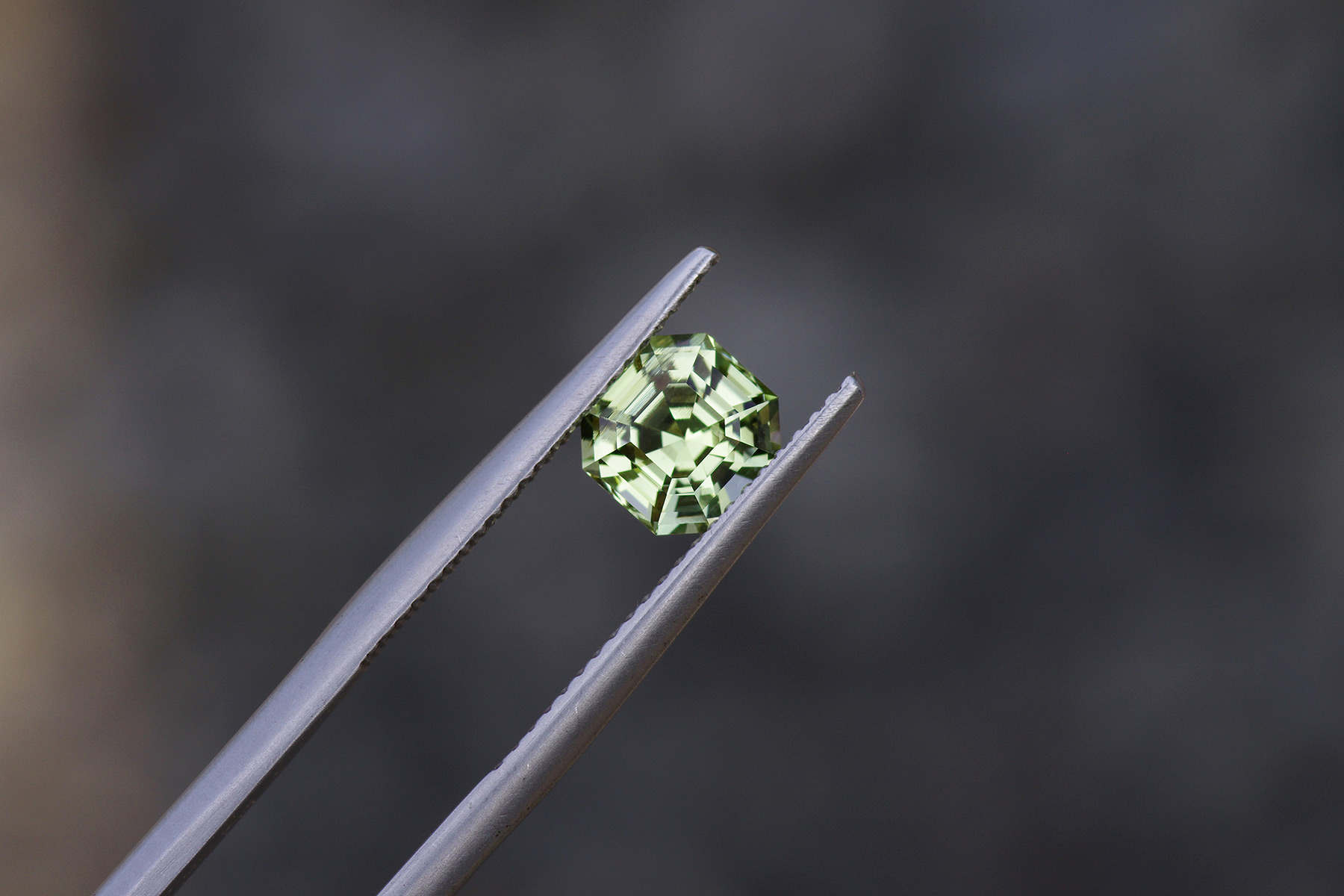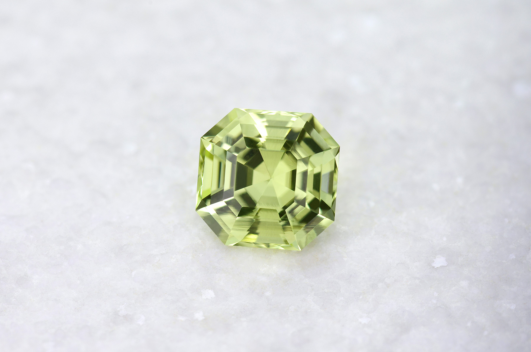 A greenish yellow chrysoberyl cut into a modified asscher cut.