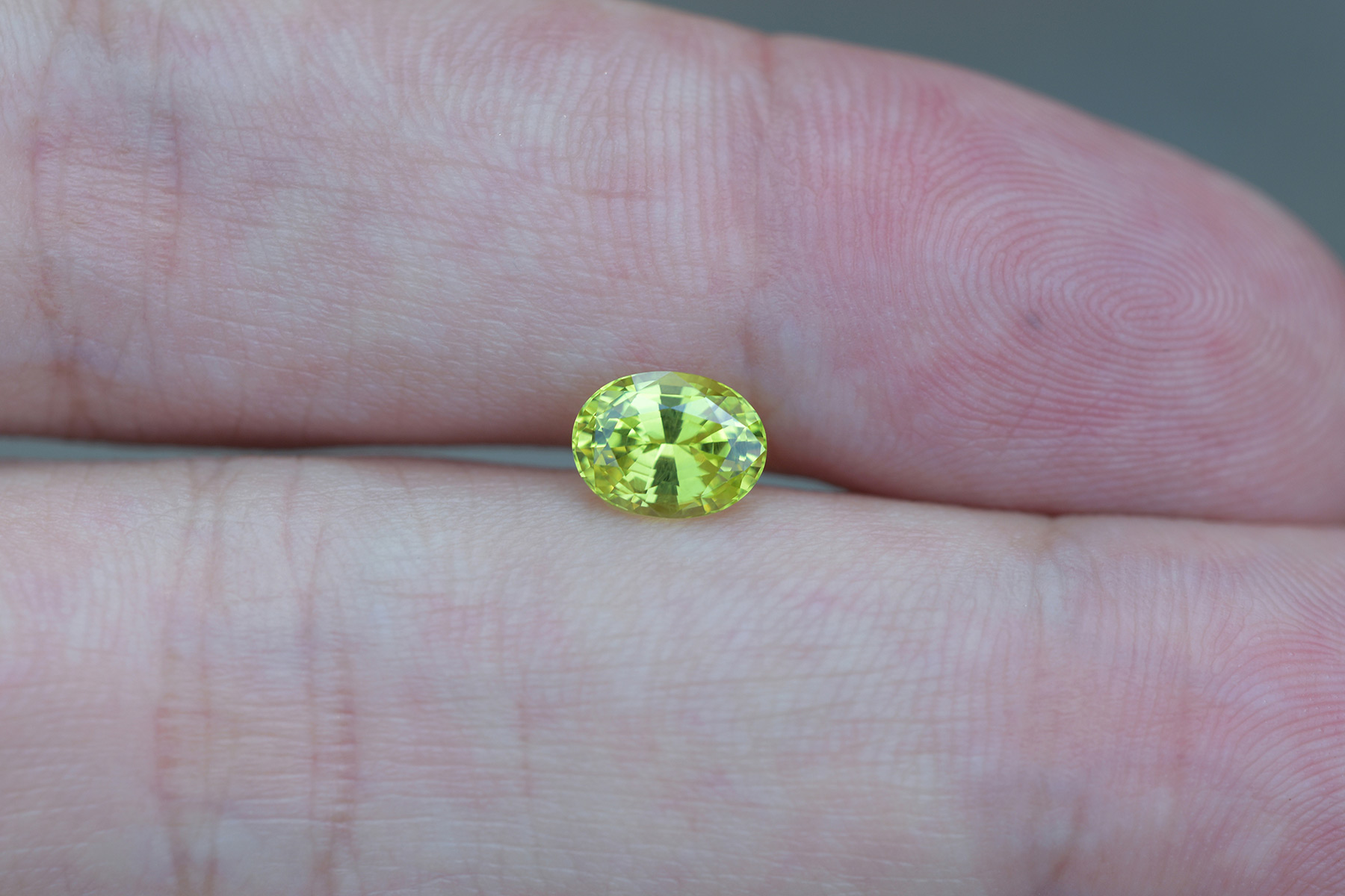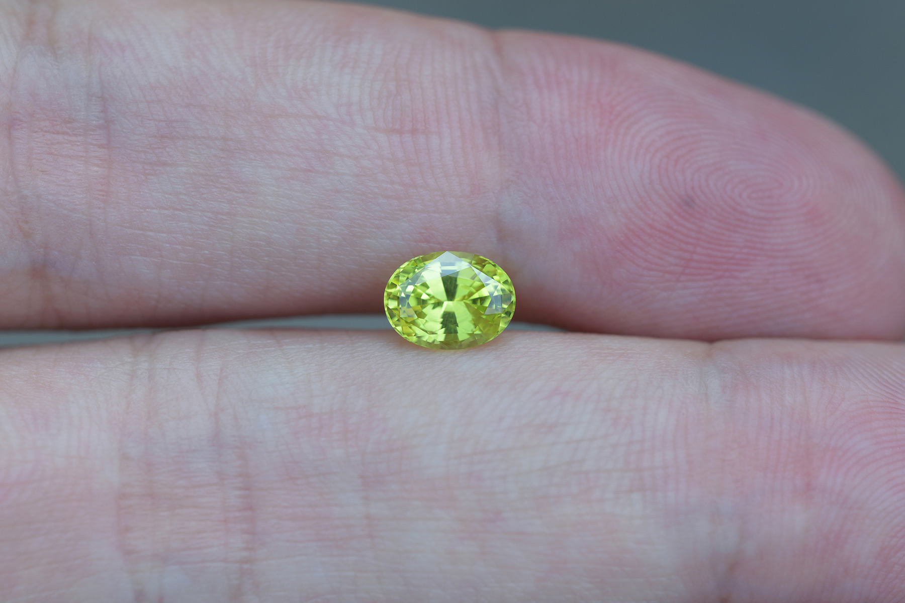 Its vivid highlighter yellow color is ultra rare, and the stone retains its saturation in all types of light: incandescent, fluorescent, indoors and outdoors equally.