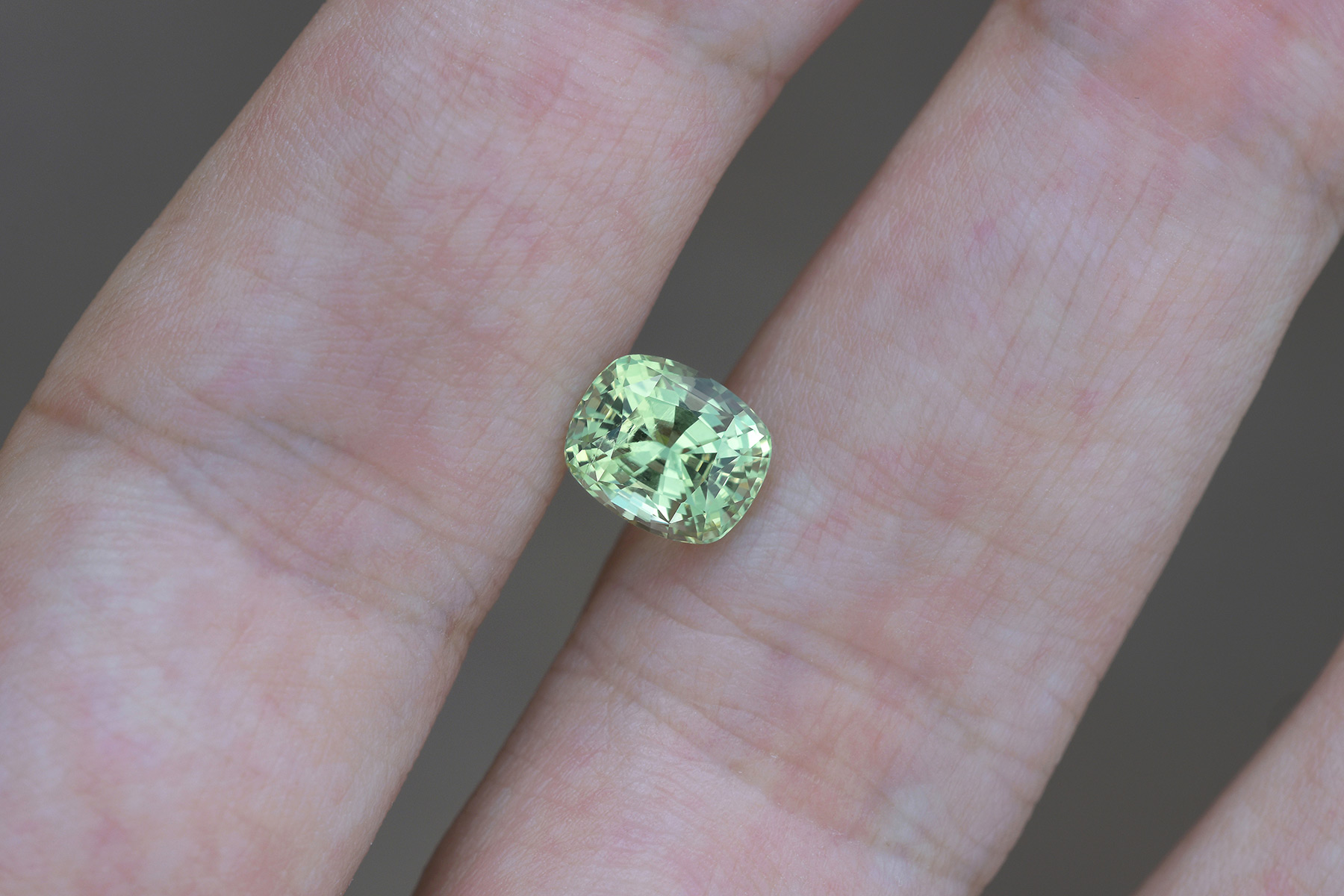 Like most other medium-light toned stones, this stone looks particularly pleasant indoors during the day and outdoors on overcast, darker days. It shows a slight color shift between bluish green in fluorescent light and greenish yellow in incandescent, as many light green chrysoberyls do.