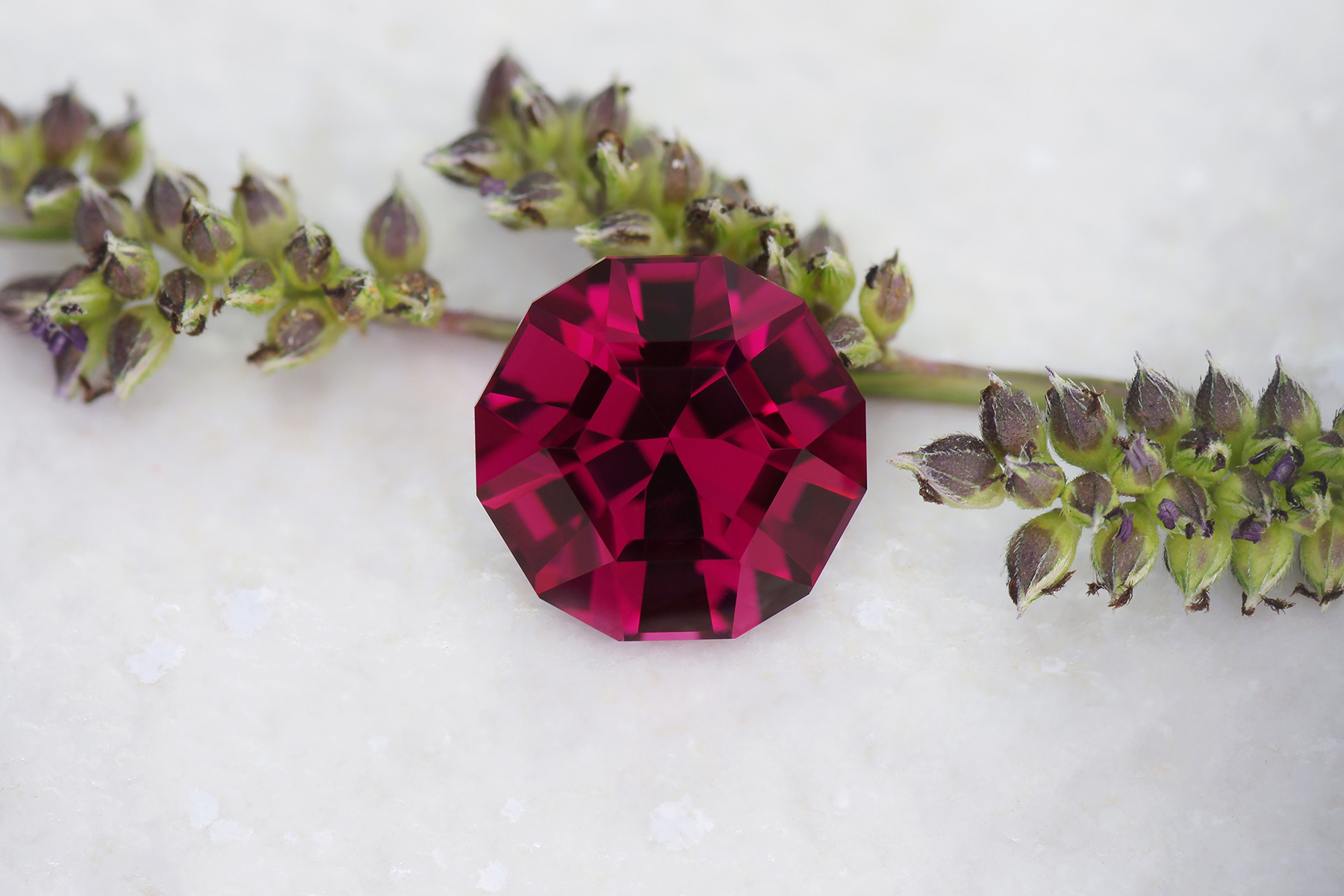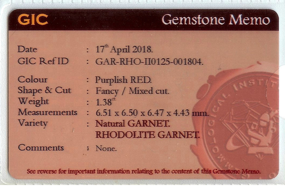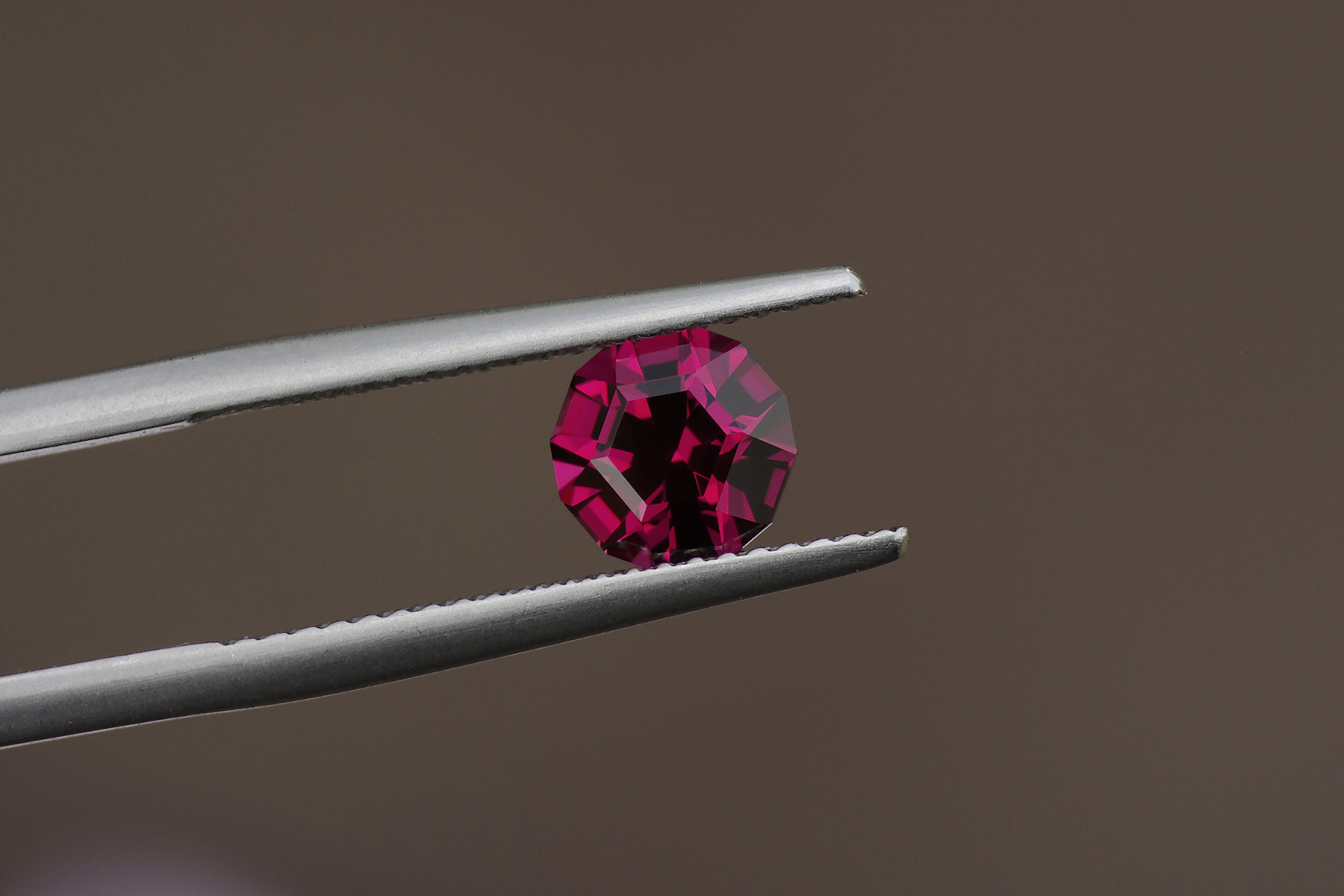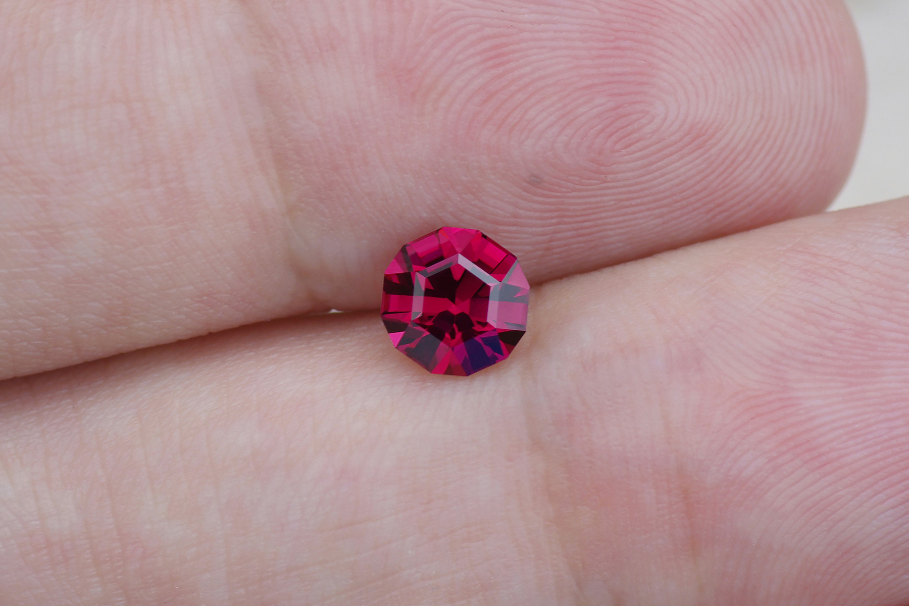 A burgundy colored loupe clean garnet recut from a 2.04 ct. badly made ‘roval’ into this clean looking dodecagon.