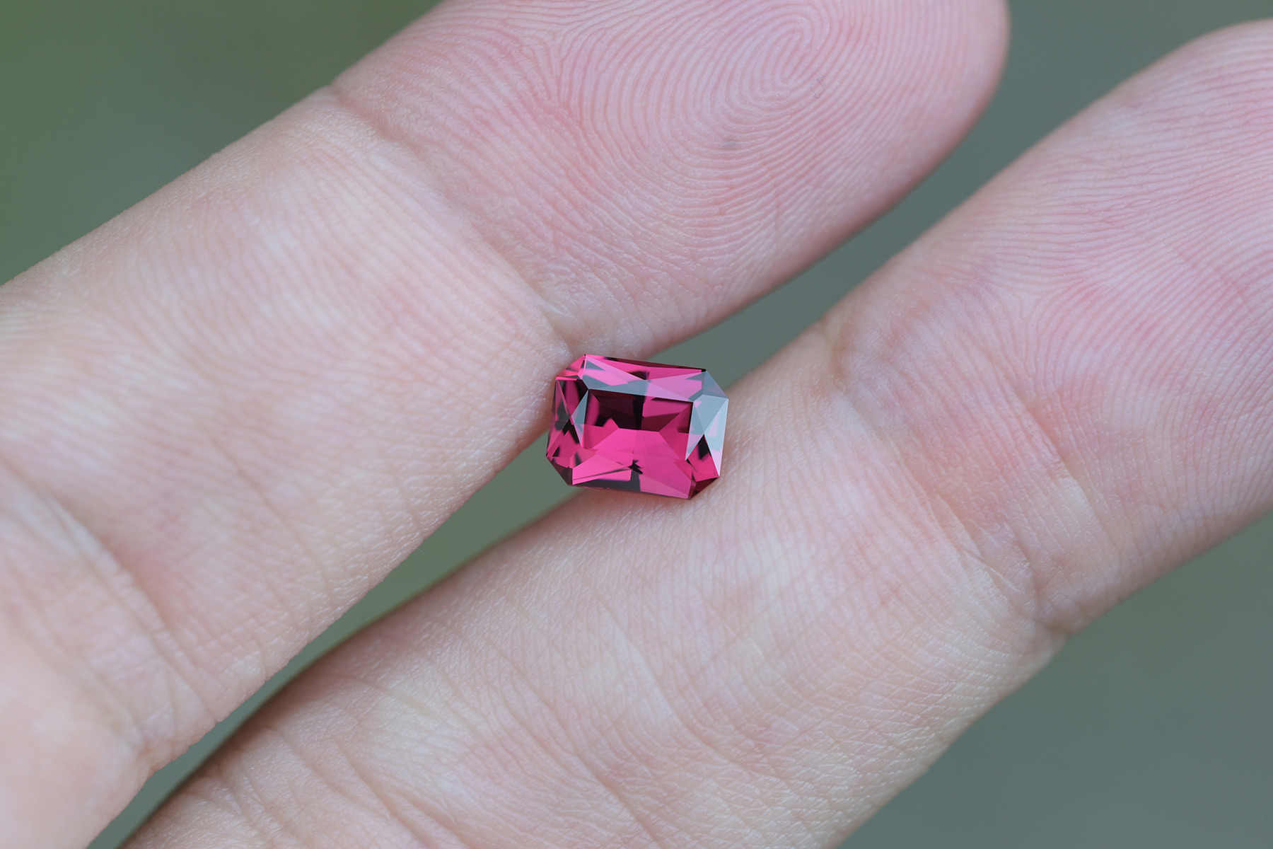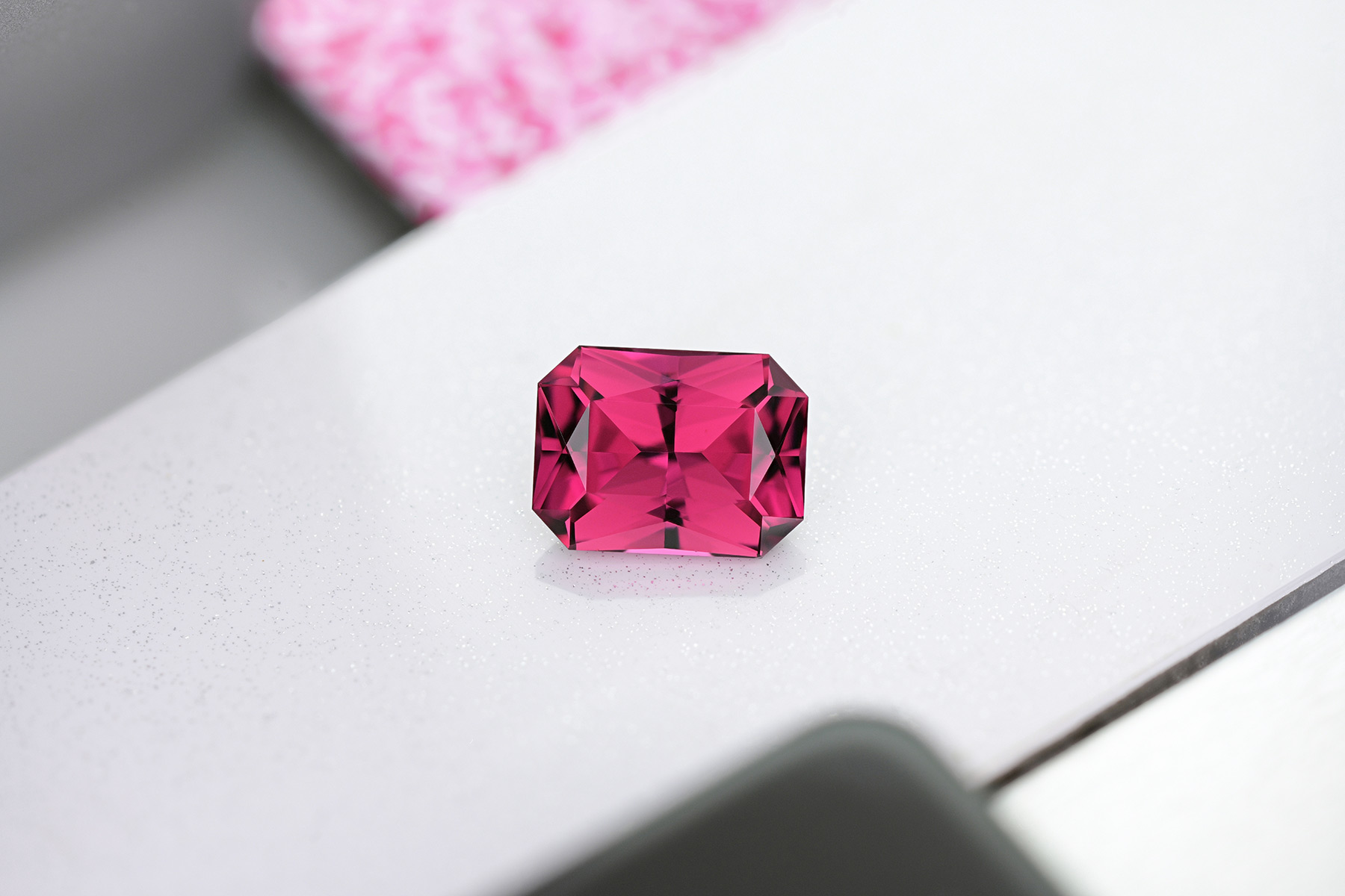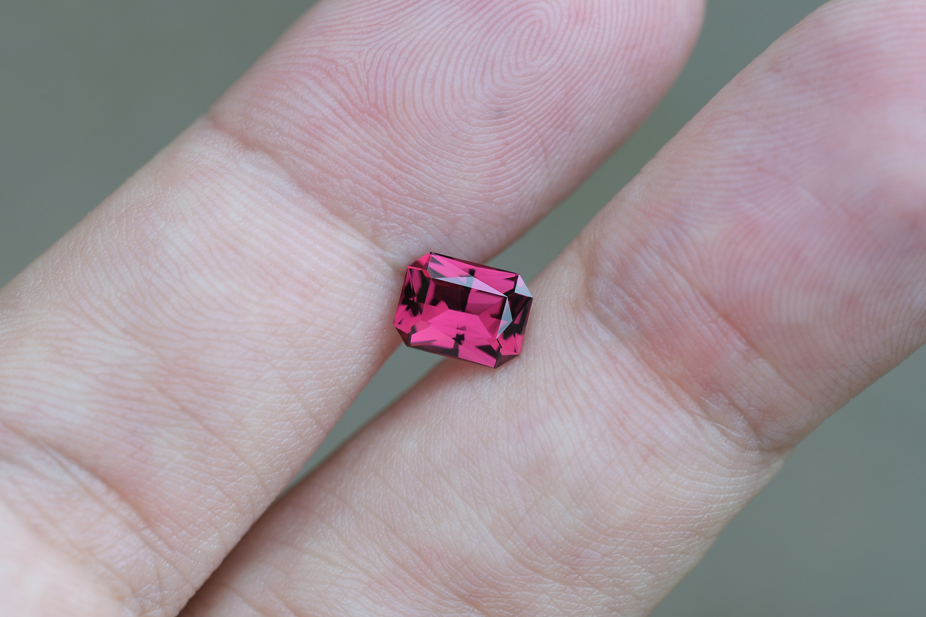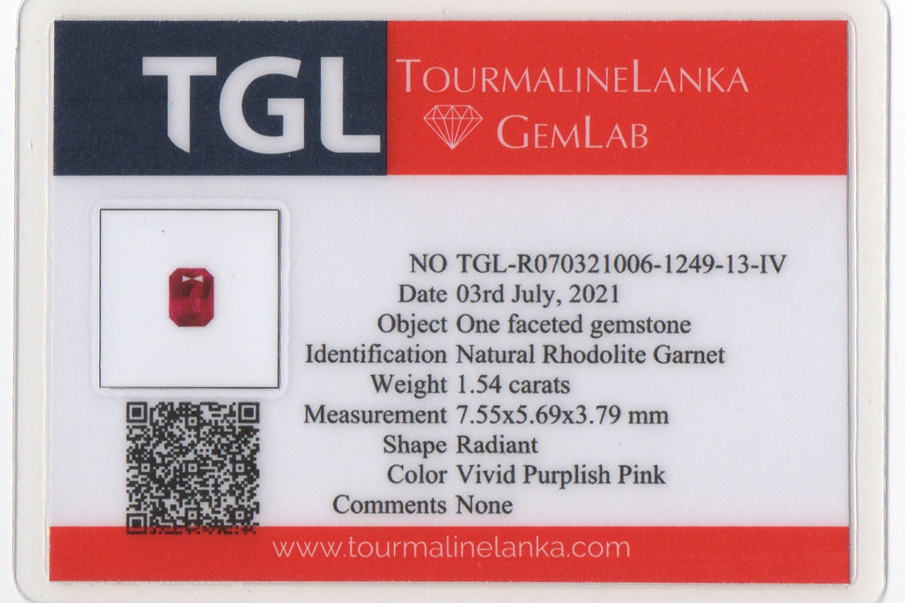 A well-saturated, clean rhodolite garnet cut into a radiant.
