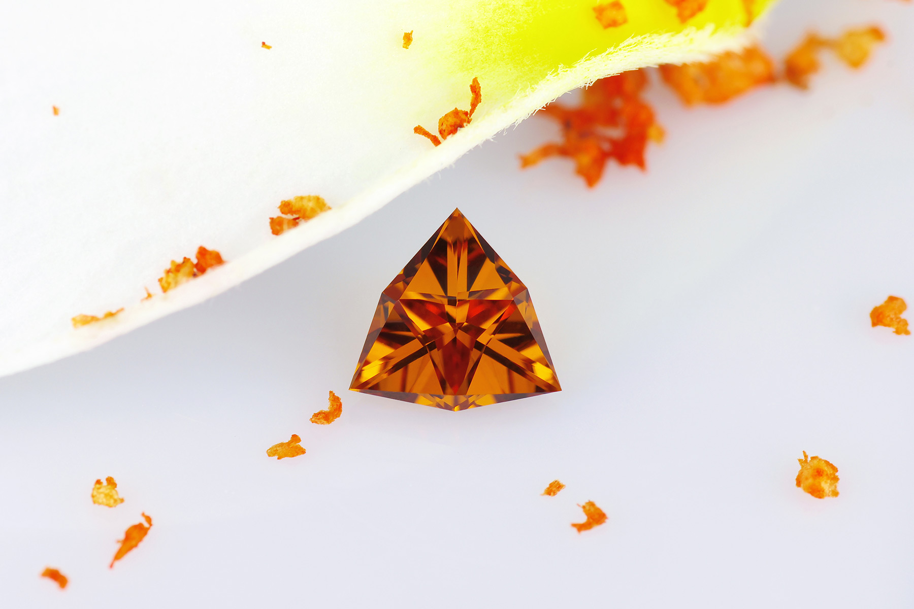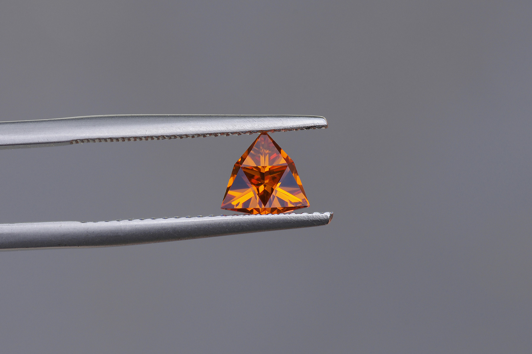 The stone was actually cut from a piece of rough of 4-something carats, but while it was possible to cut around a carat and a half in a standard trillion cut, the stone would have had some inclusions – so the rough was instead ground away until eventually only the loupe clean part of it remained.