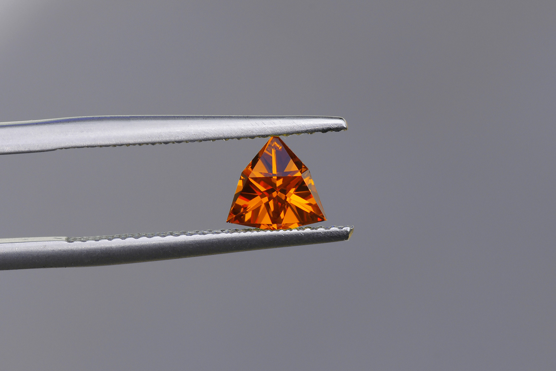 A bright and crystal-clear hessonite cut into one of A. Akhavan's sharp looking designs.