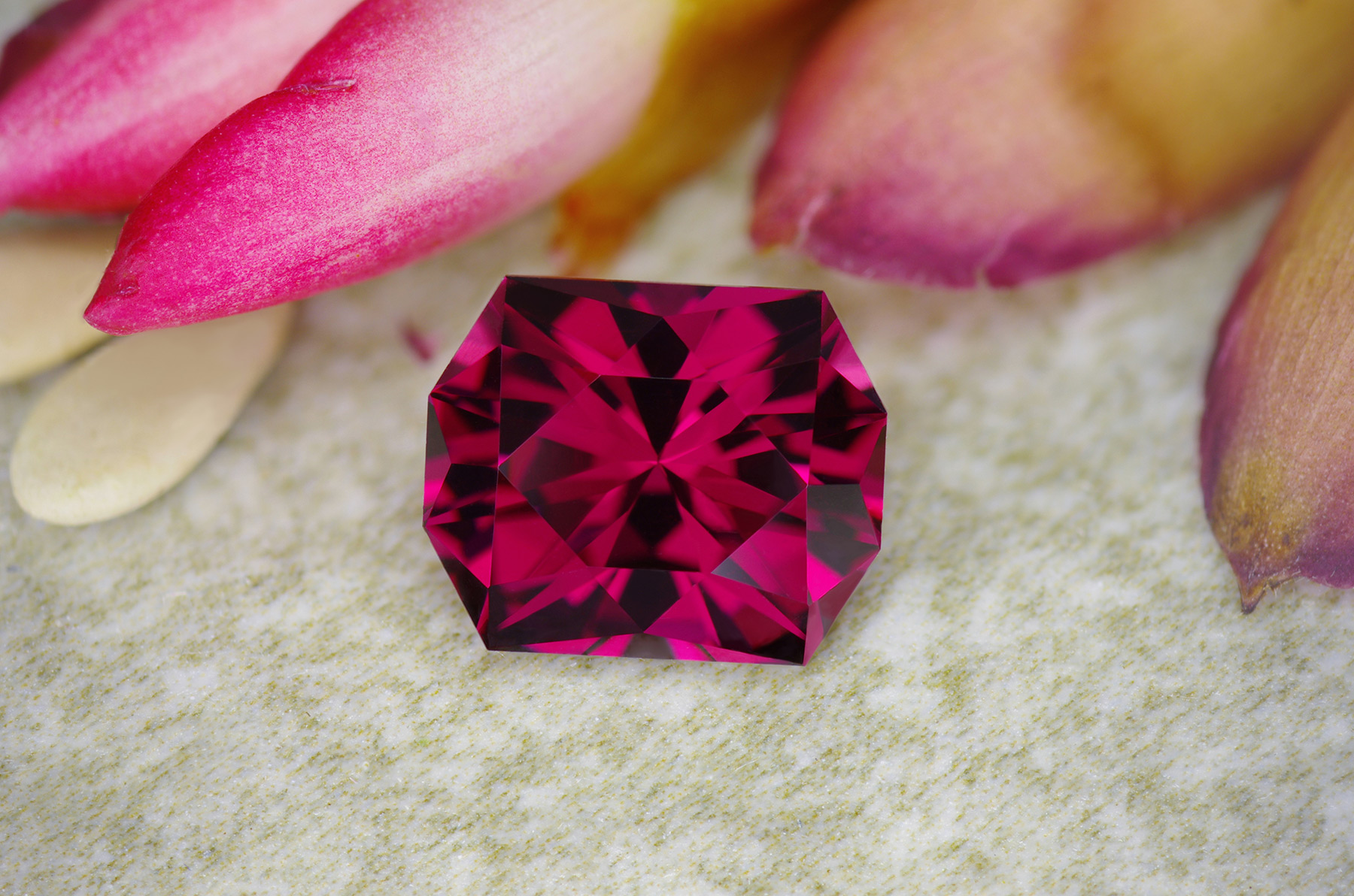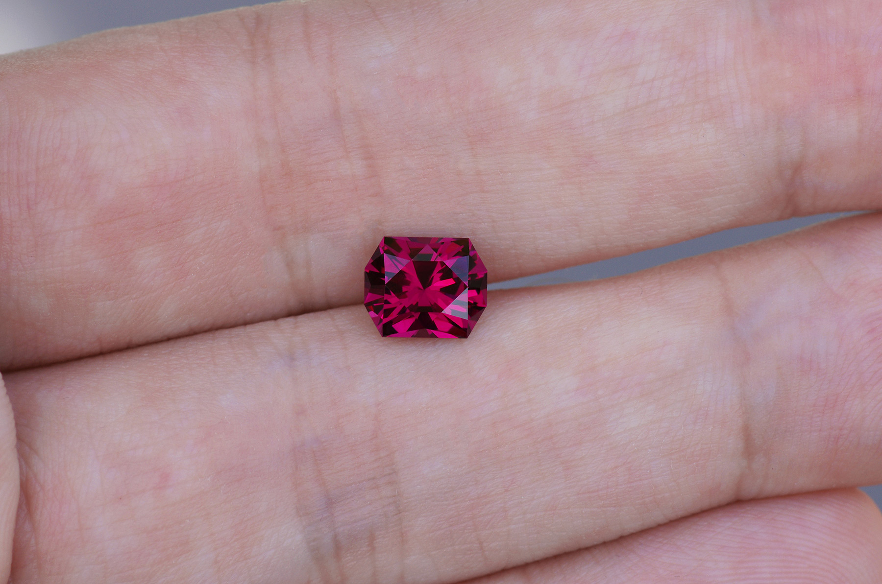 An intensely reddish purple garnet recut from a 3.83 carat commercial cushion into a loupe clean, sparkly and well made modified rectangular cushion.
