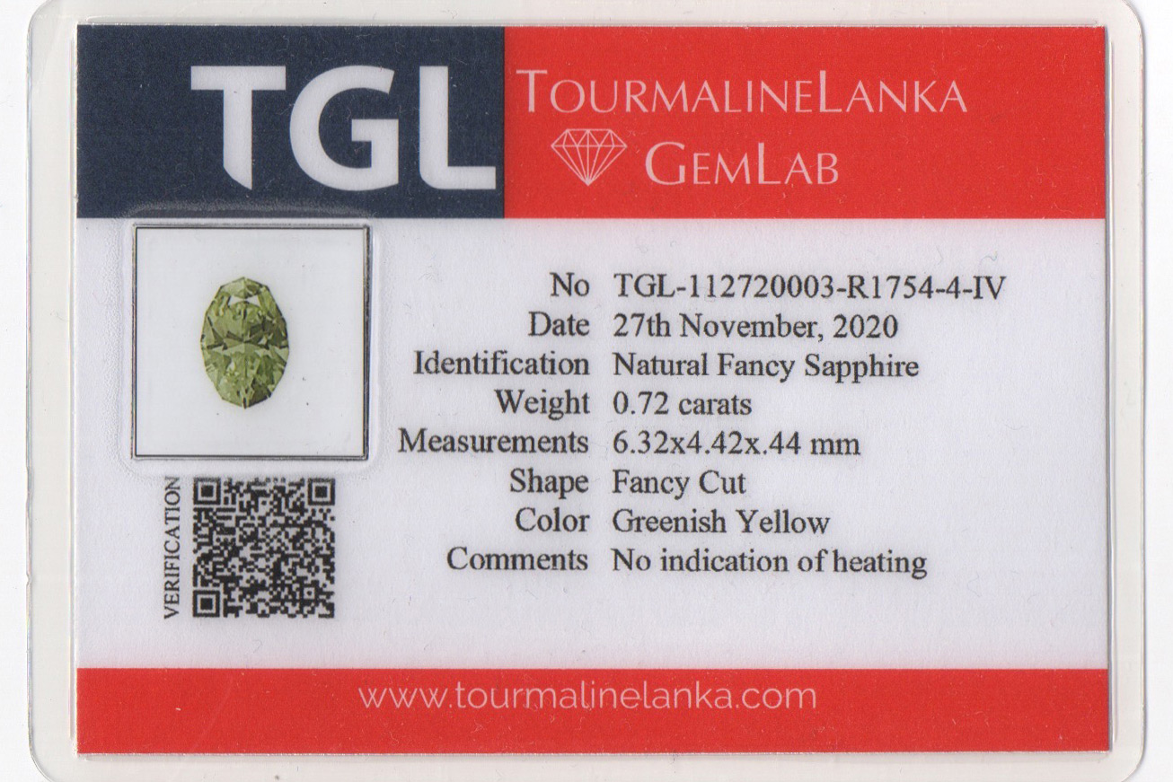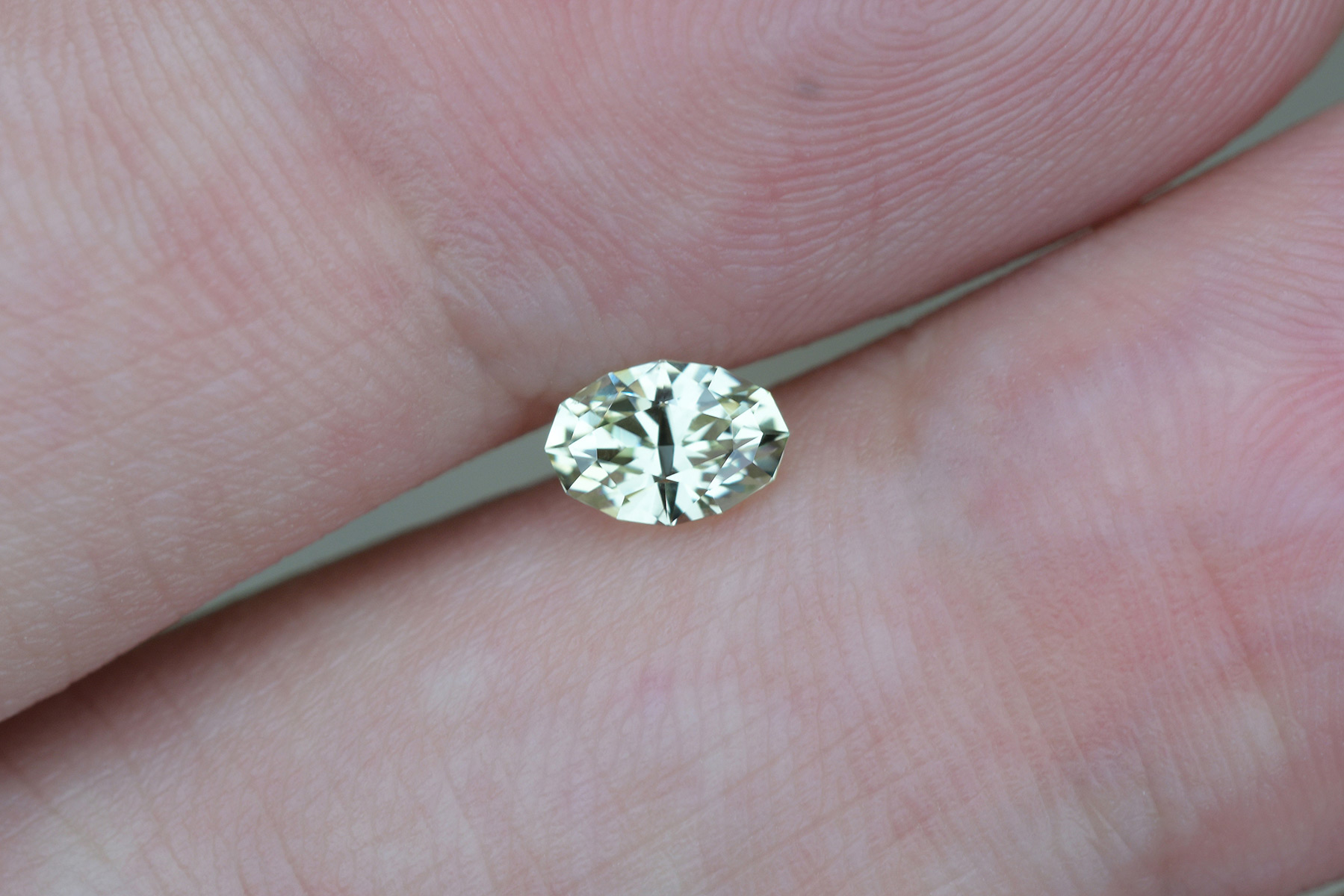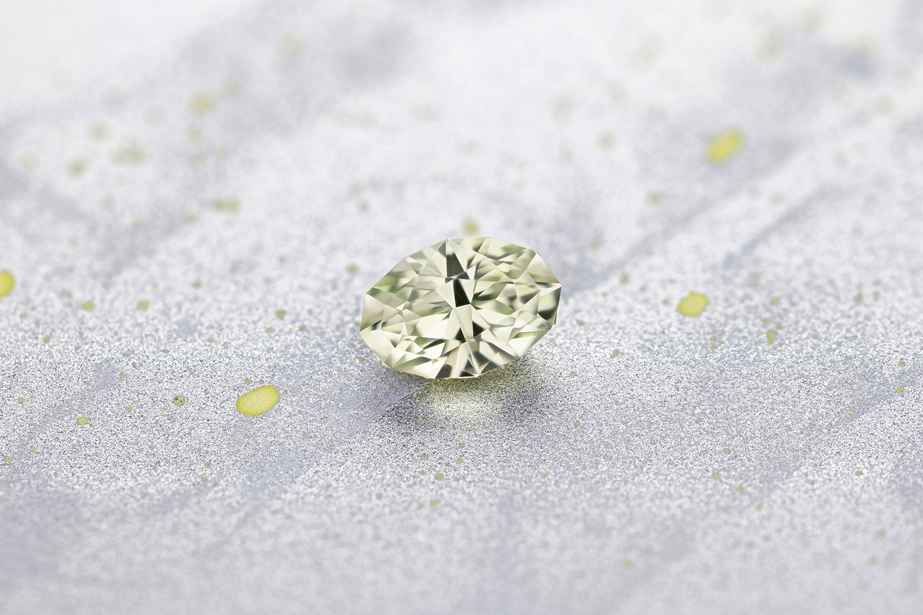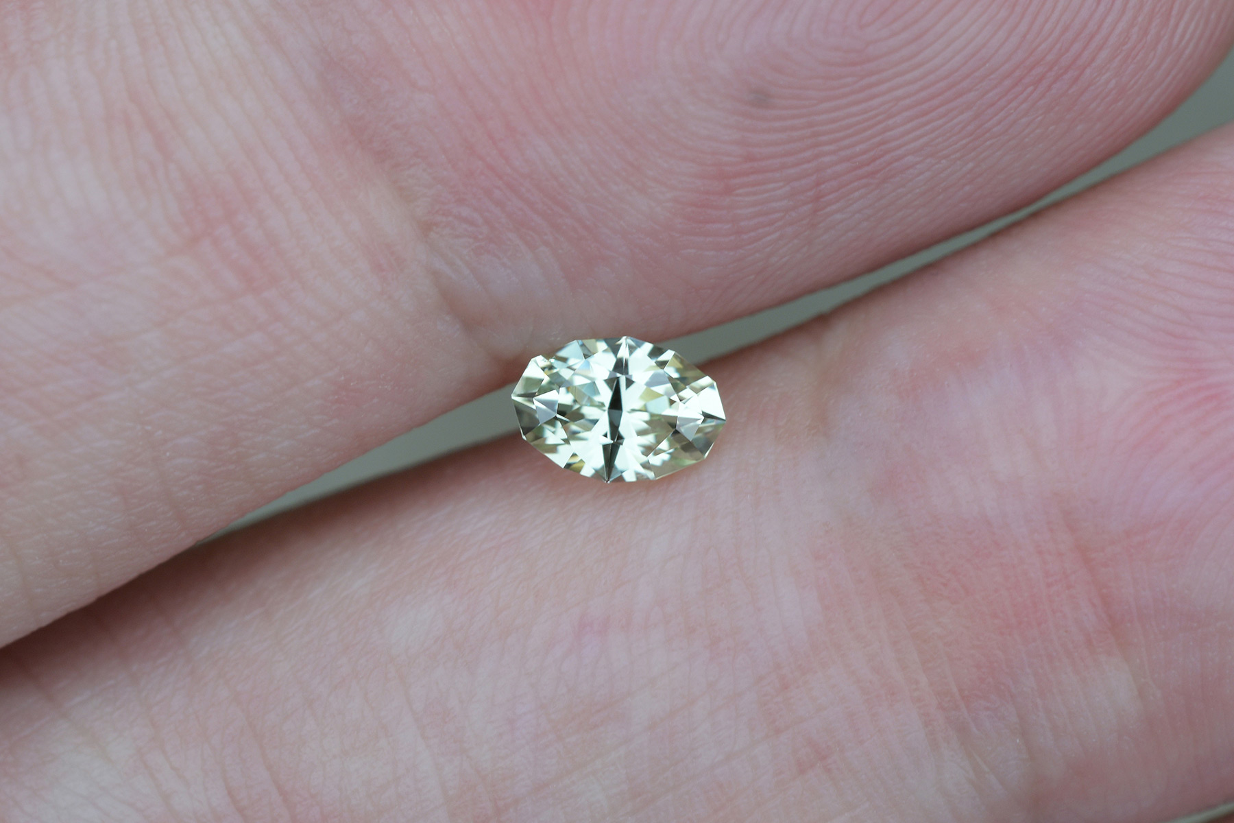 A brilliant, bright chartreuse sapphire cut into a fancy barion oval.